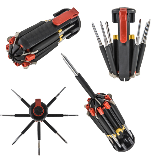 Multi herramienta 8 en 1 con cuerpo de plástico, desarmador, clip y 6 leds, utiliza 3 baterías AAA (no incluidas).
