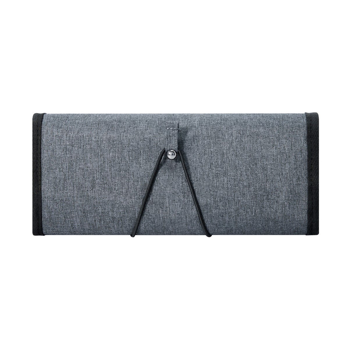 Organizador enrollable para accesorios. Contiene dos compartimentos con cierre y malla, un compartimento intermedio con bandas elásticas y un compartimento con dos bolsillos. Cierre con elástico.