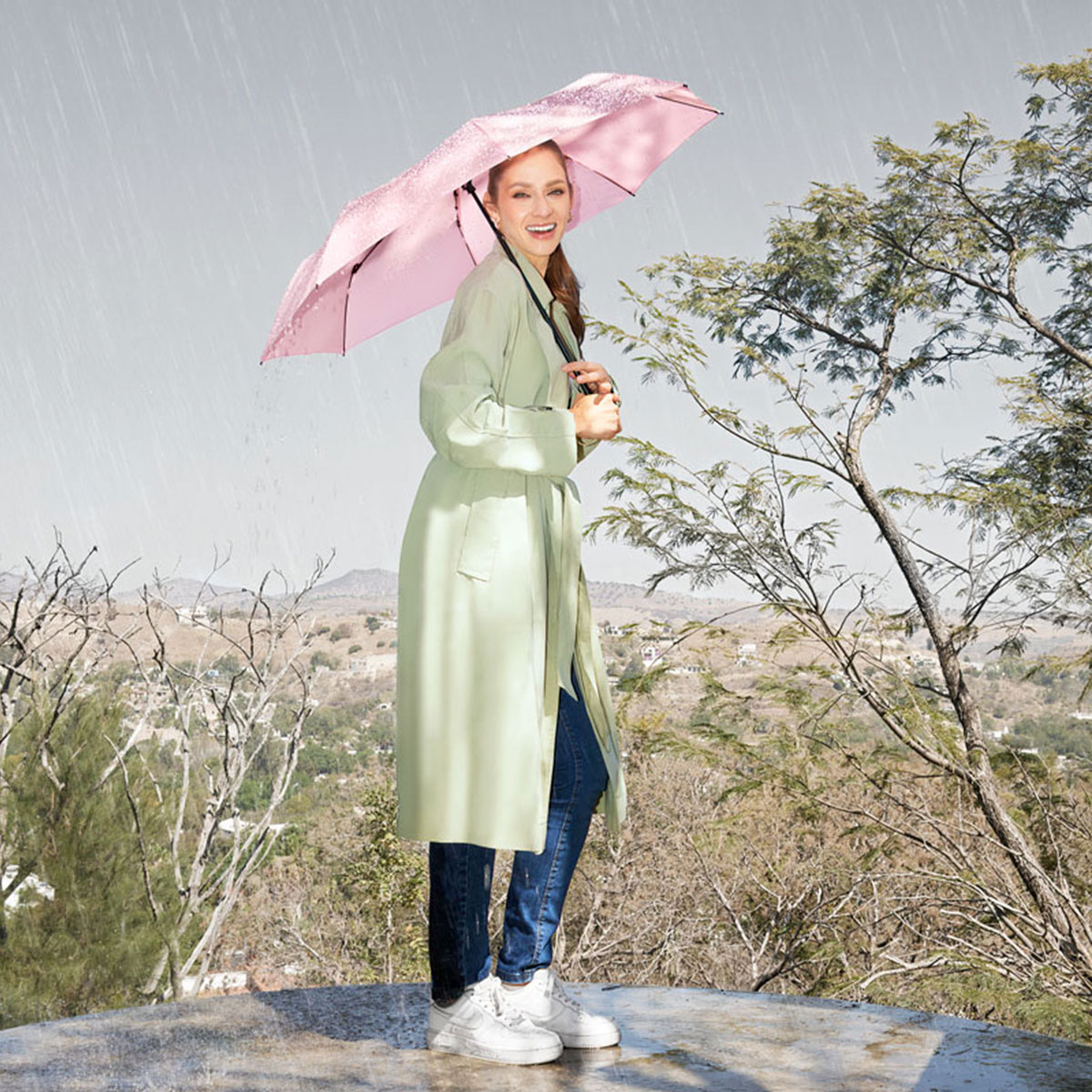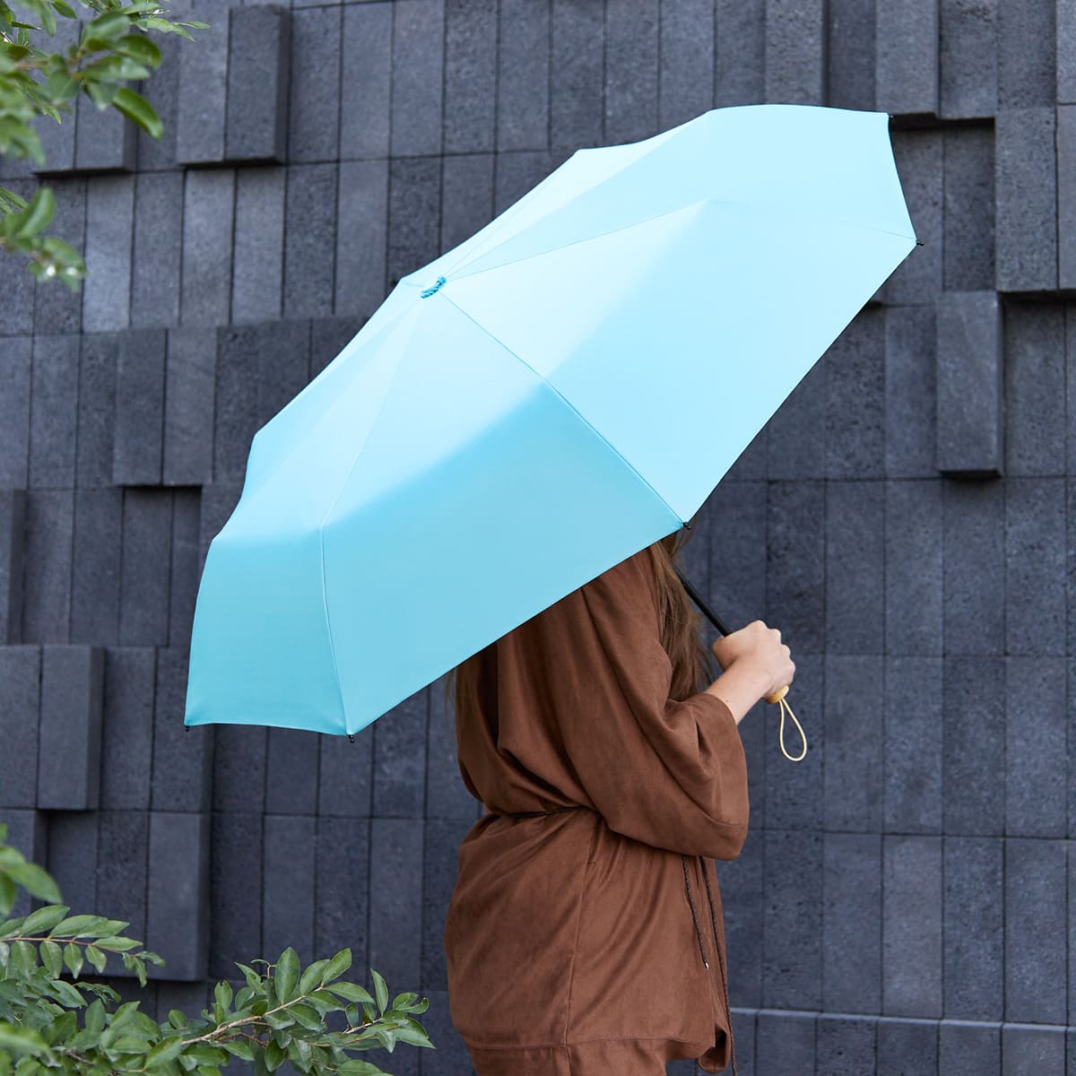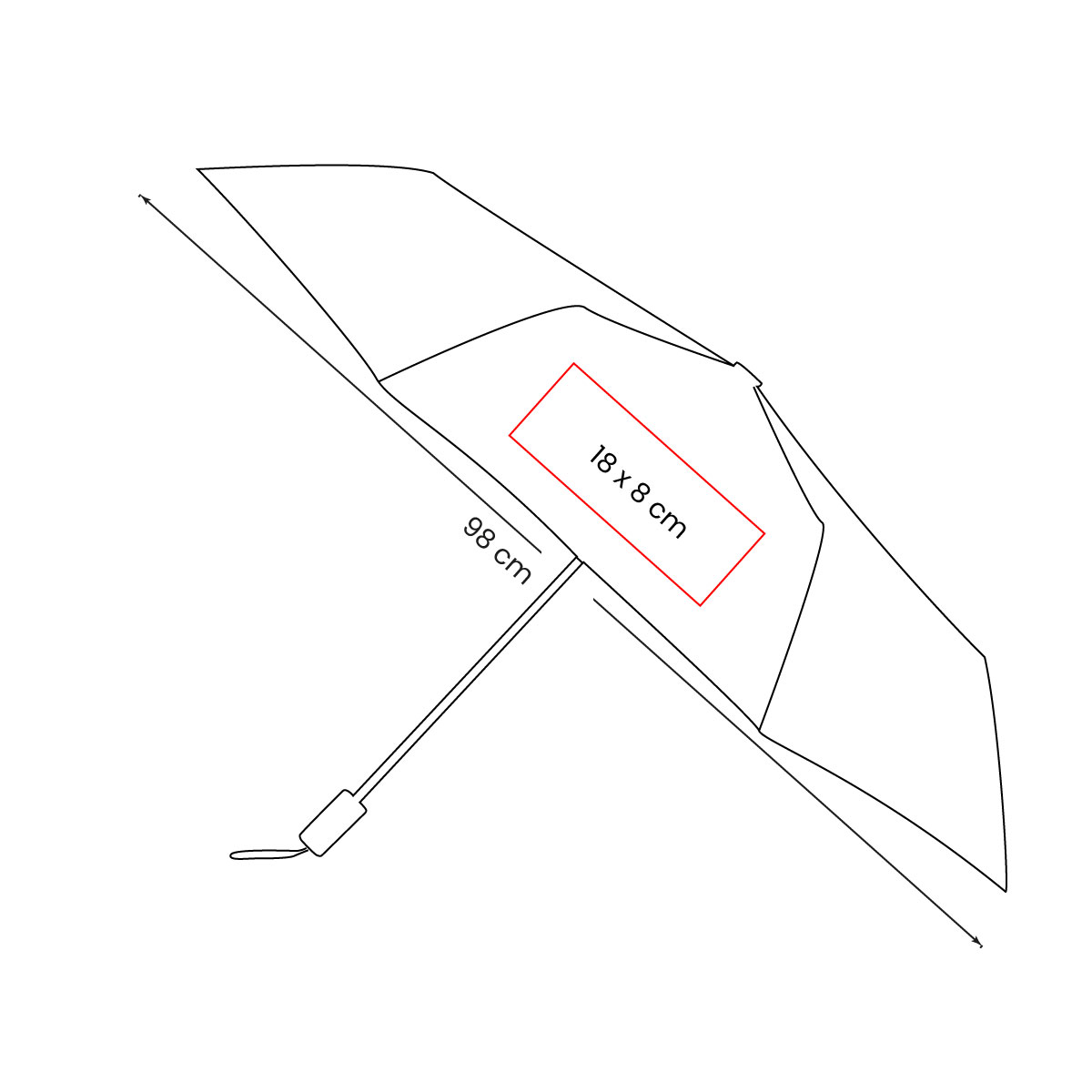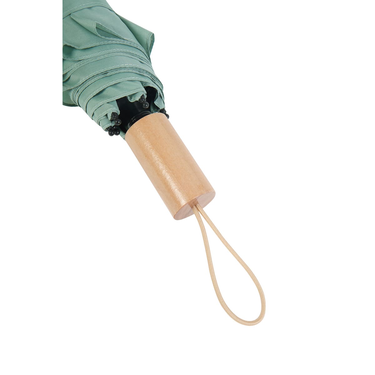 Paraguas de bolsillo de 8 paneles. Sistema de abertura manual. Mango de madera con asa elástica. Incluye funda individual con botón metálico que permite abrir y guardar el paraguas fácilmente.