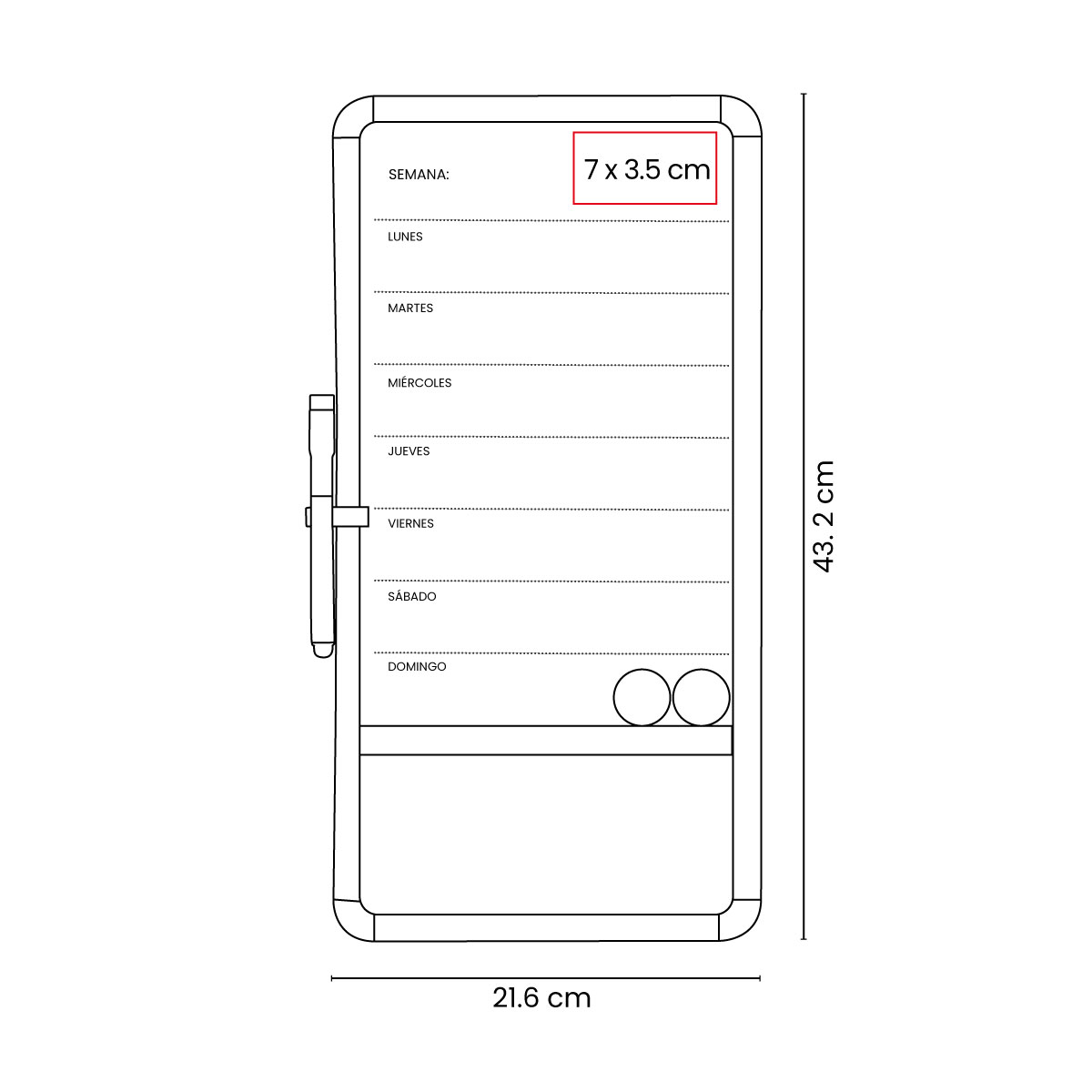 Pintarrón con planeador semanal ideal para organizar tus tareas más importantes. Incluye marcador en color negro con borrador. Superficie magnética para sujetar notas, mientras que la parte inferior cuenta con una sección de corcho para colocar papeles o documentos. Gracias a su gancho en la parte superior, este pintarrón es fácil de colgar. Incluye dos imanes adhesivos para fijar en la pared.