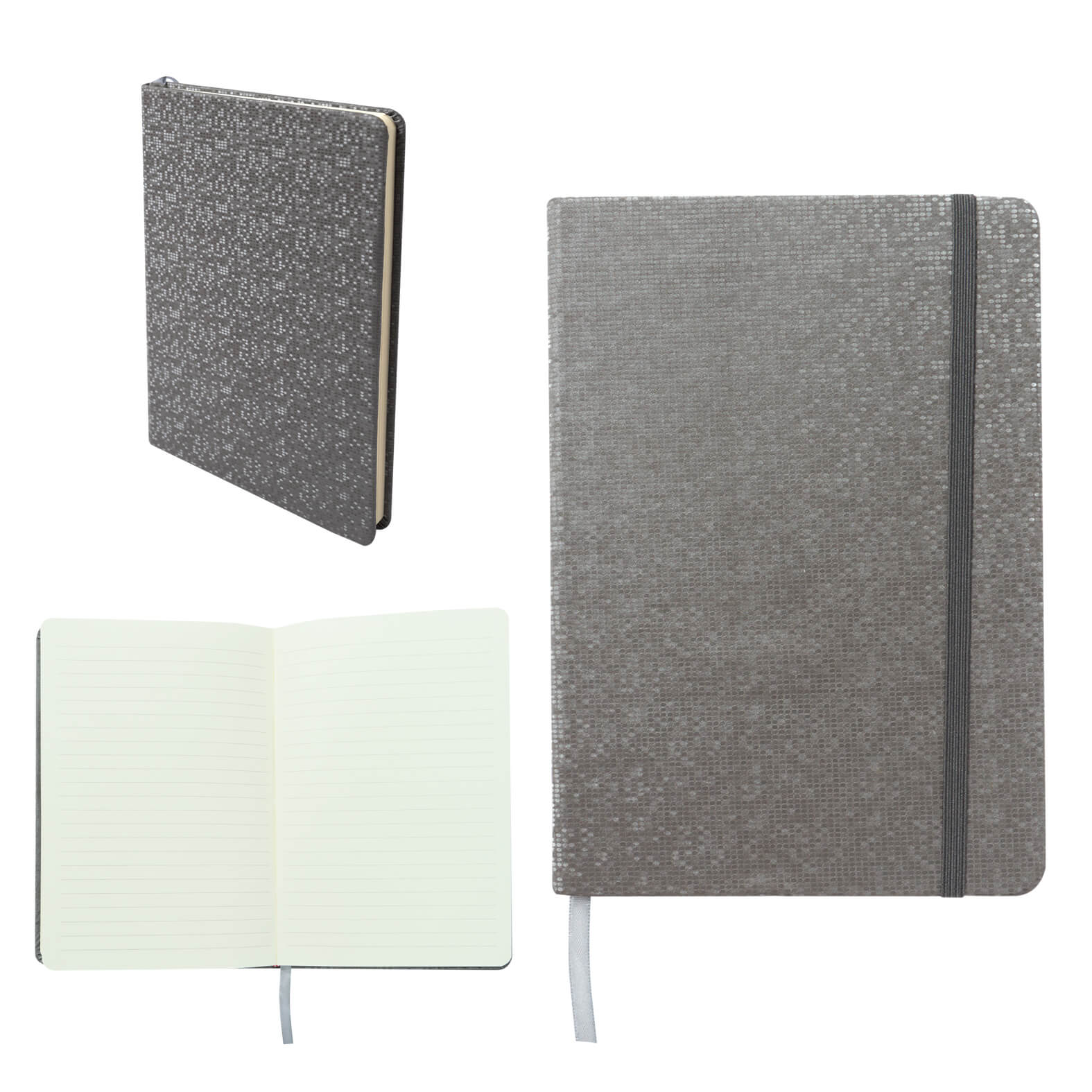 Libreta de poliuretano con reflejante en forma de píxeles, 96 hojas de raya, separador y banda elástica.