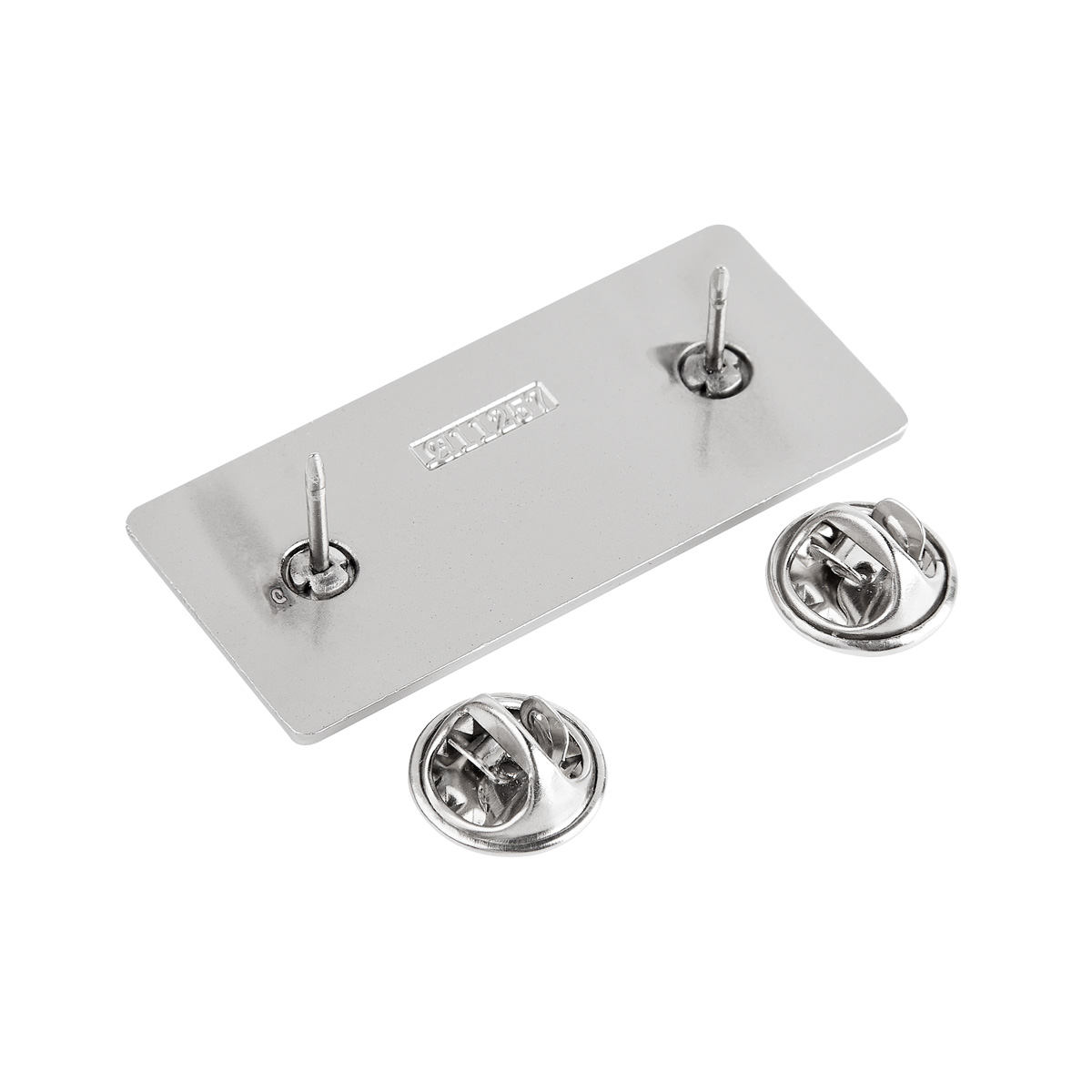 Placa metálica para grabado. Incluye 2 pines de presión. Grosor máximo de encaje 5 mm. Disponible a la venta únicamente en la compra de algún producto textil de catálogo. El precio incluye el grabado de un logo y una posición. Mínimo para grabado de 50 piezas. No aplica grabado personalizado.