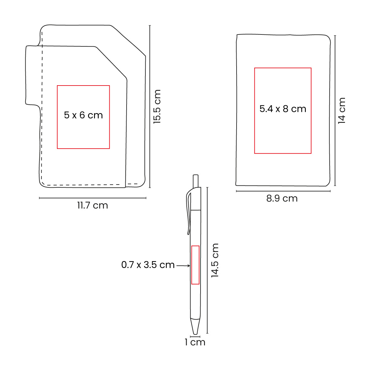 5 x 6 cm Porta Pasaporte / 5.4 x 8 cm Libreta / 0.7 x 3.5 cm Bolígrafo