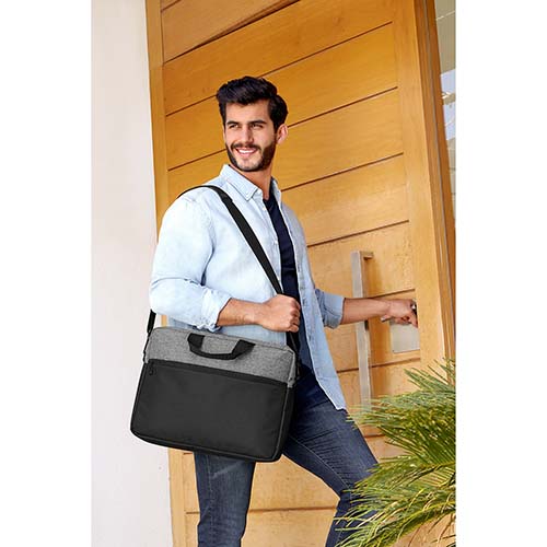 Bolsa principal y frontal con cierre. Espacio para laptop de 15″. Incluye correa ajustable y desmontable, aditamento especial trasero para colocar en trolley y asas de agarre superior.