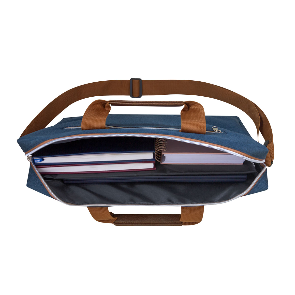 Portafolio con diseño compacto y ligero. Sus asas con detalles de curpiel, proporcionan un agarre cómodo y sofisticado. La bolsa principal con cierre tiene un compartimento para laptop de hasta 15″ y un espacio adicional específico para tus pertenencias. La bolsa frontal es perfecta para artículos más pequeños. Además, la banda en la parte posterior facilita el transporte en trolley, brindándole aun mayor versatilidad y comodidad para su desplazamiento.