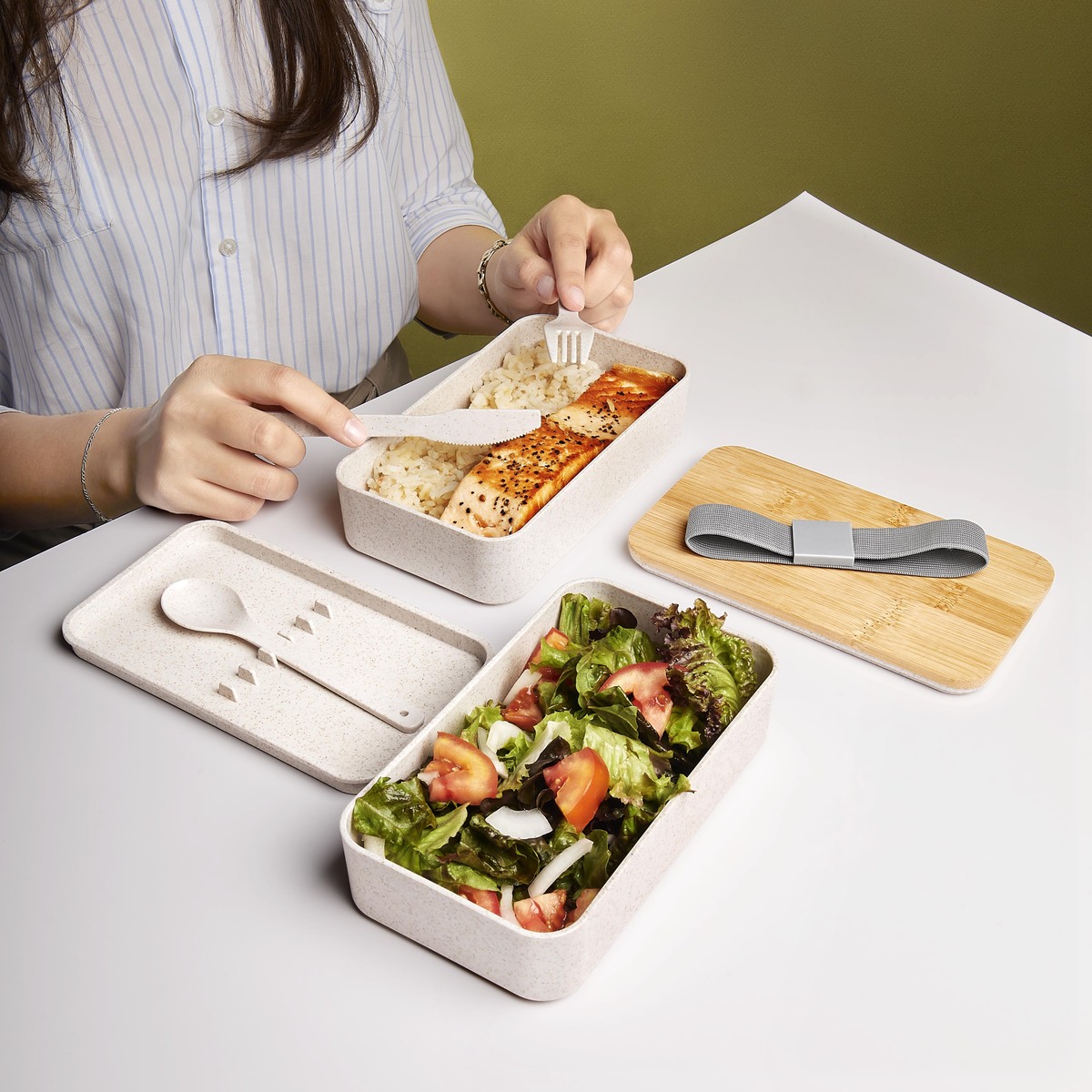 Contenedor de alimentos con doble compartimento. Capacidad total de 1 litro. Incluye tenedor, cuchillo y cuchara. Su fabricación lo hace amigable con el medio ambiente, al incorporar fibra de Trigo en sus materiales. La elegante Tapa de bambú asegura tus alimentos y la banda elástica mantiene todo firmemente cerrado. Práctico y versátil, este set es apto para lavavajillas y microondas, excluyendo la Tapa de bambú. La madera es un producto natural el cual puede presentar variaciones en tonalidades y vetas.