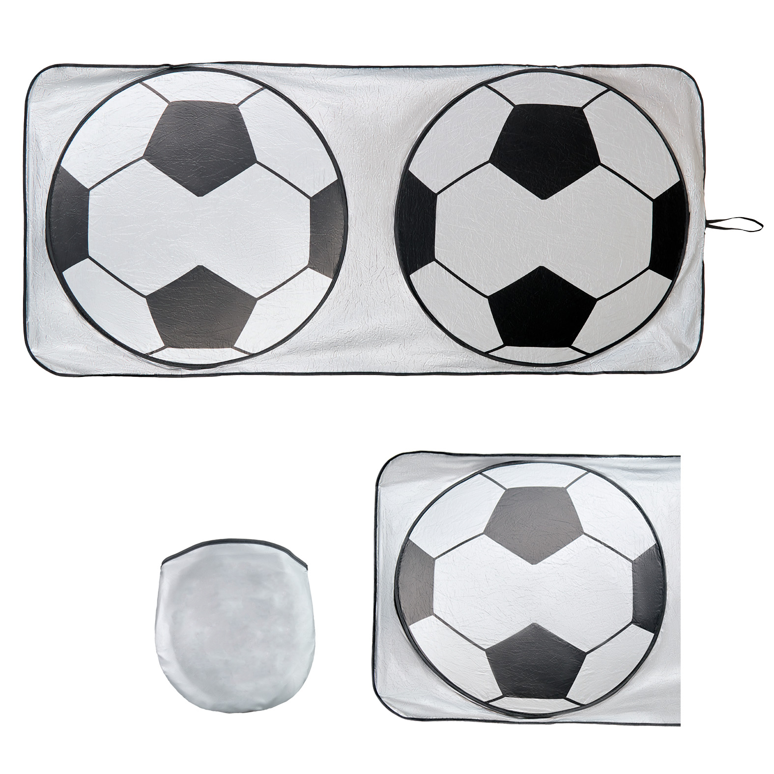 Parasol panorámico plegable de poliéster para auto con impresión de balón y funda para guardar.