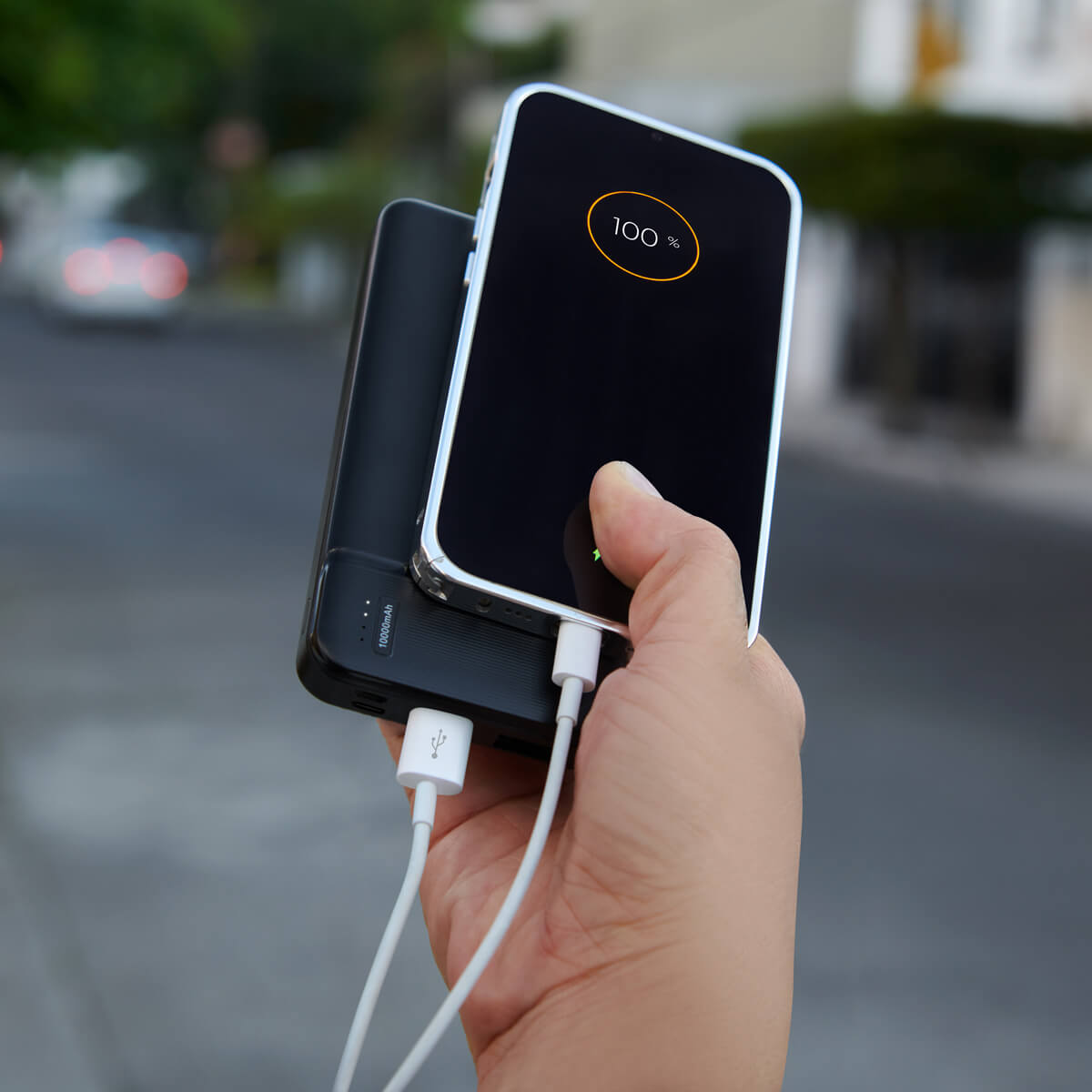 Batería auxiliar para smartphone, capacidad 10,000 mAh. Contiene 2 puertos USB, 1 micro USB y 1 tipo C exclusivo para recarga de la batería (no carga dispositivos). Incluye 4 LEDs indicadores de carga y cable micro USB.