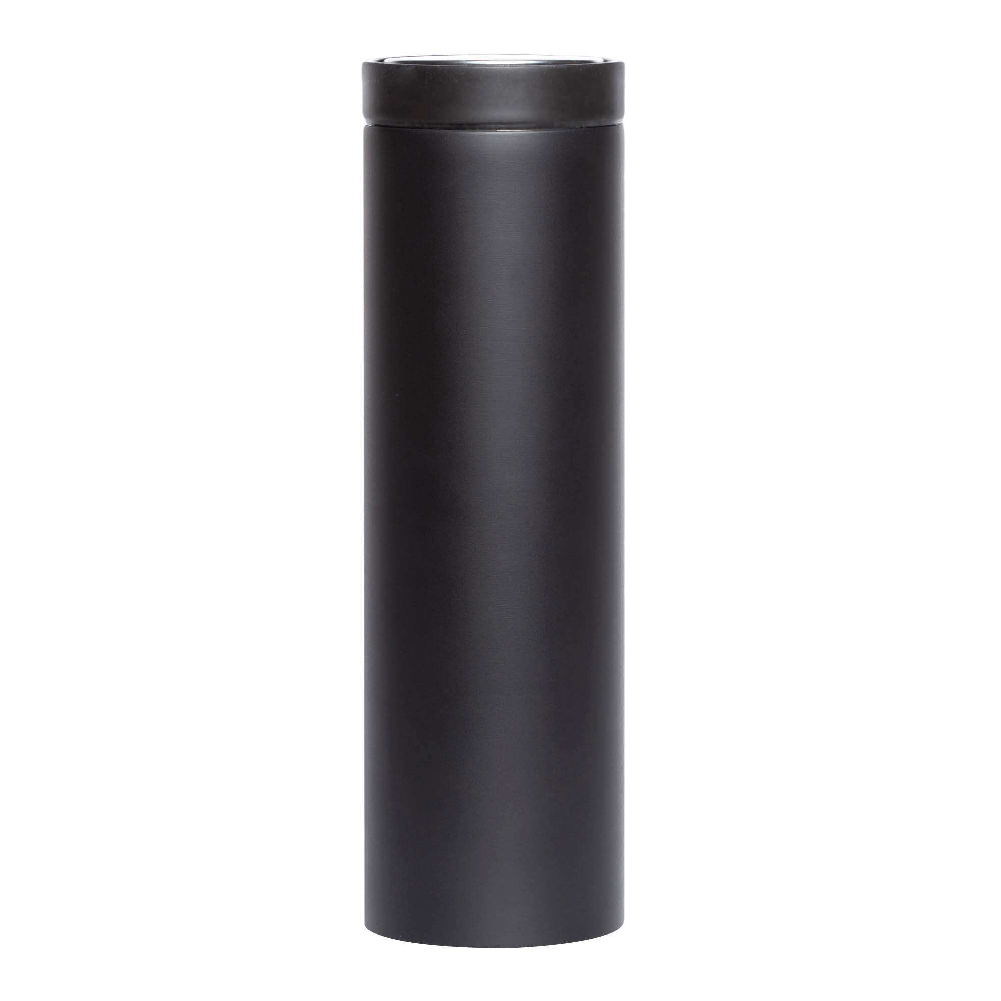 Termo con doble pared de acero inoxidable, tapa enroscable y botón en la parte superior.
