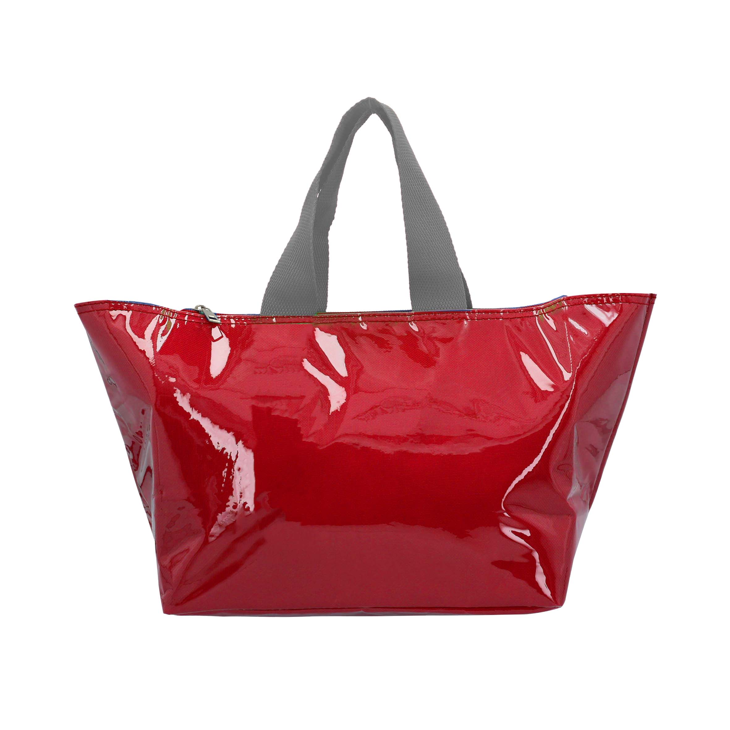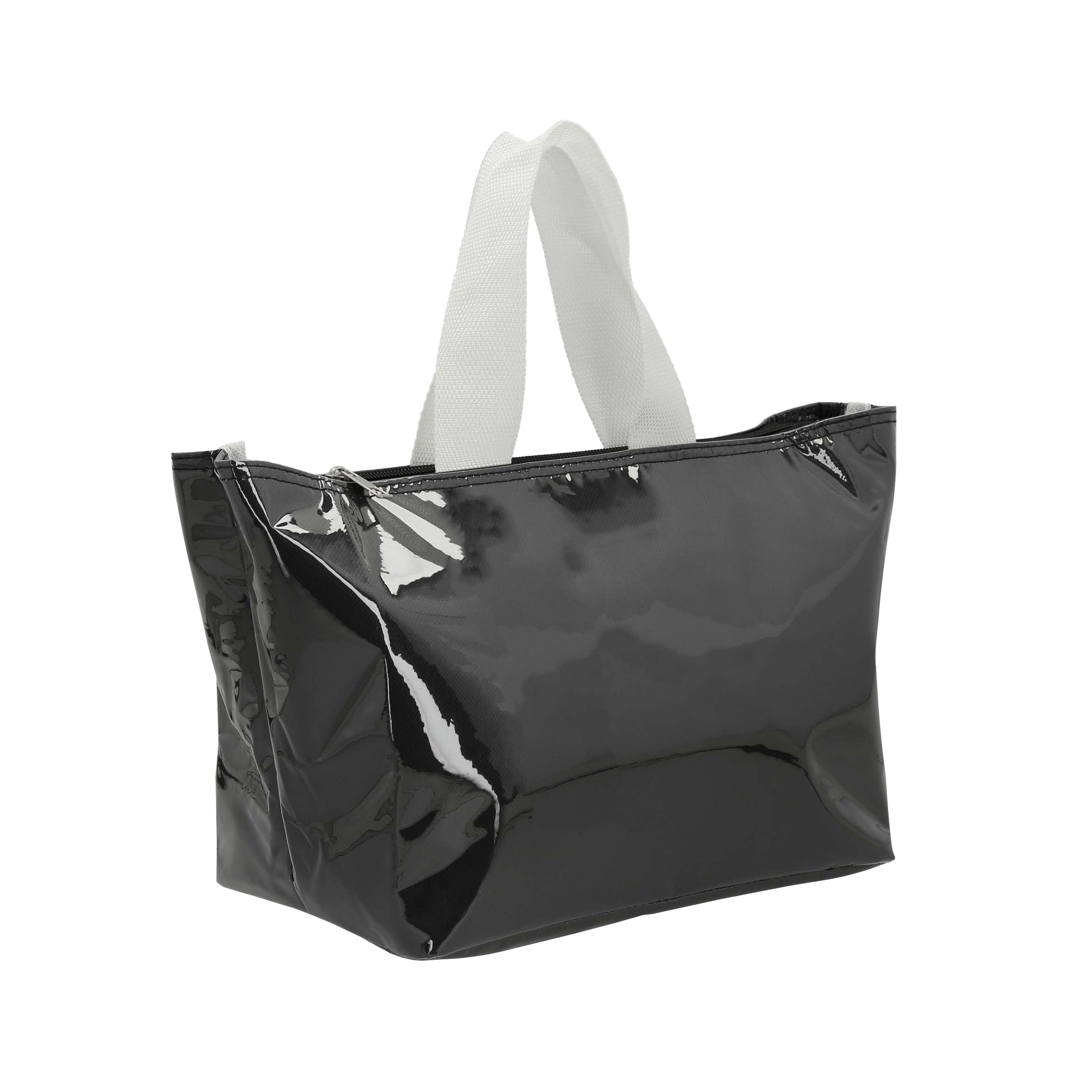 Lonchera con interior metalizado, exterior de plástico, cierre y doble asa.