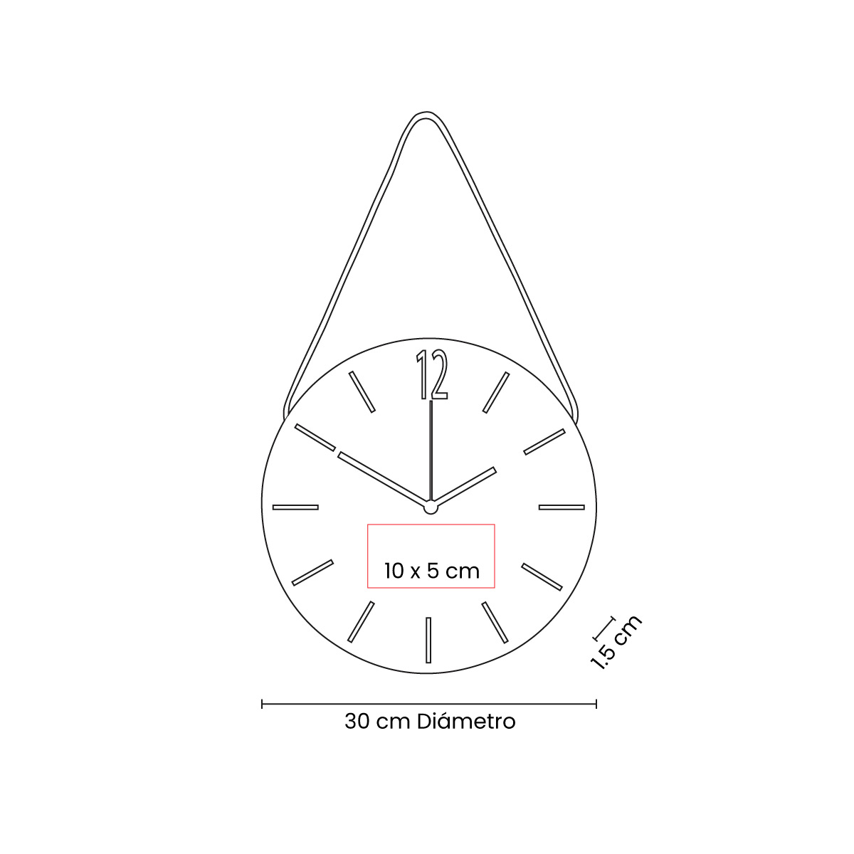 Reloj de pared con lazo. Batería (1 pila AA) no incluida.