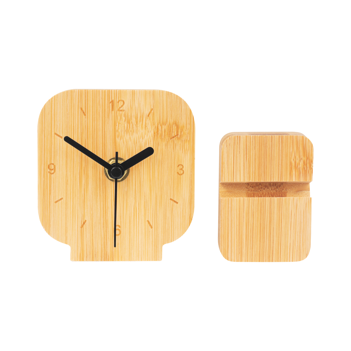 Reloj de escritorio con base desmontable. Diseño compacto, ideal para escritorio o buró. Las manecillas silenciosas evitan el ruido «Tic Tac». La madera es un producto natural el cual puede presentar variaciones en tonalidades y vetas.