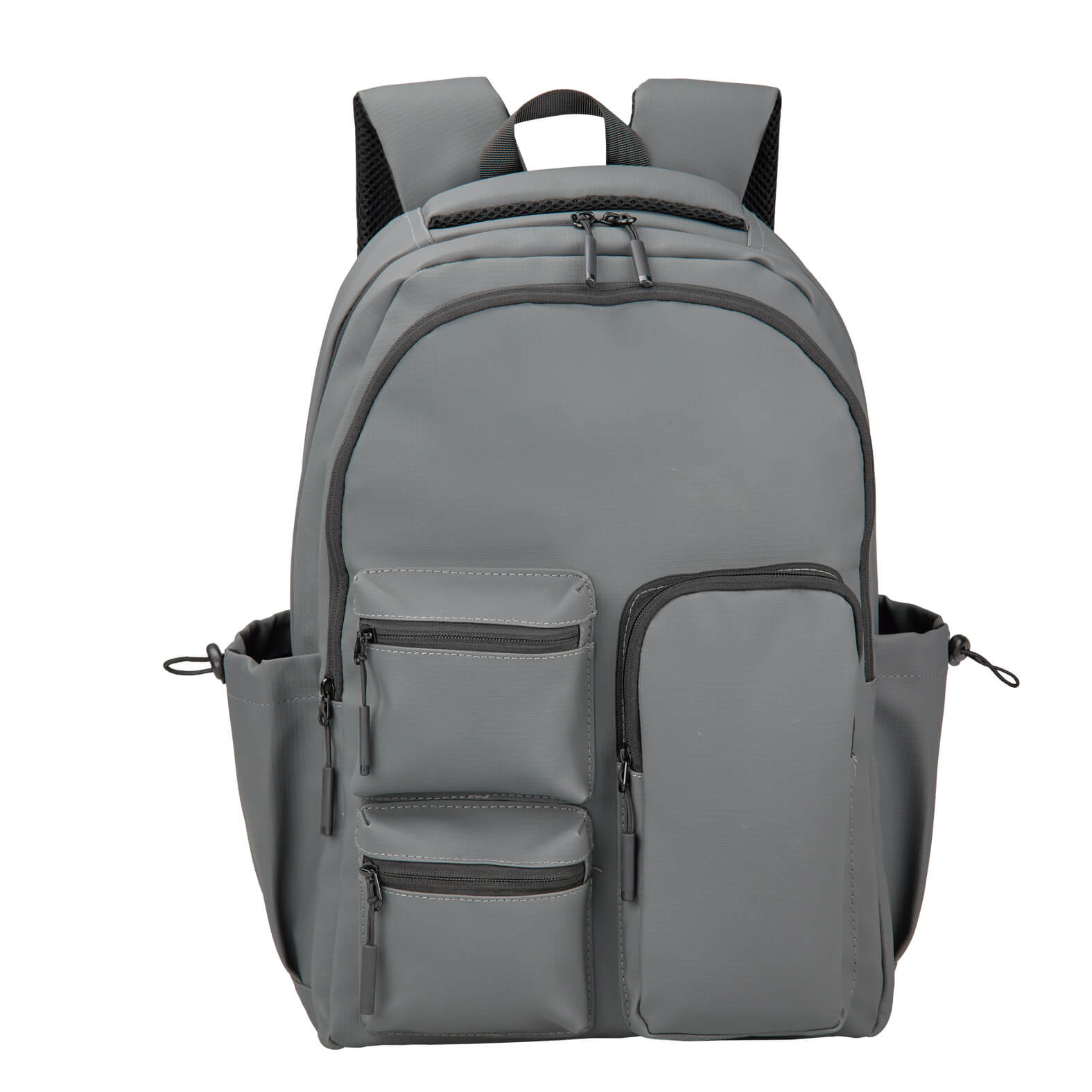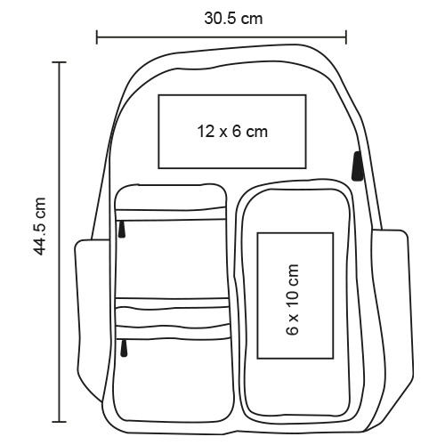 Mochila con compartimento principal con porta laptop de 17″, cuatro compartimentos frontales de diferentes tamaños con cierre, dos bolsas laterales, respaldo y tirantes acolchados, asi como asa superior.