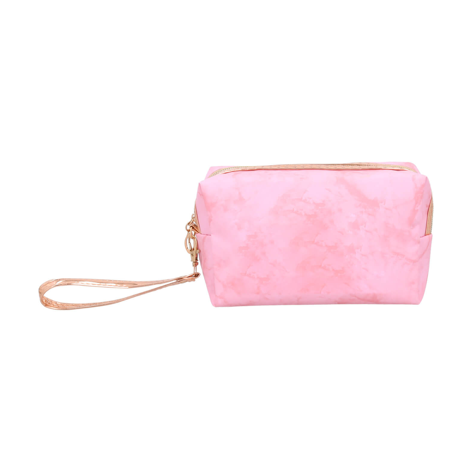 Cosmetiquera de poliéster con apariencia de mármol, interior forrado, cierre y correa.
