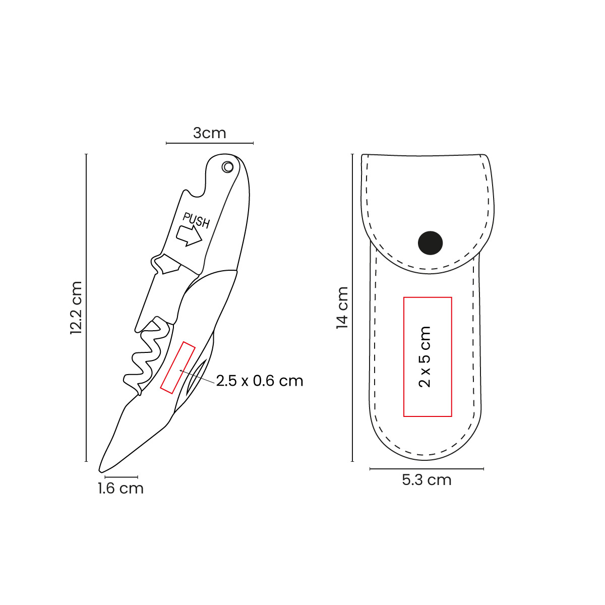 3 x 12.2 x 1.6 cm Sacacorchos / 5.3 x 14 cm Funda