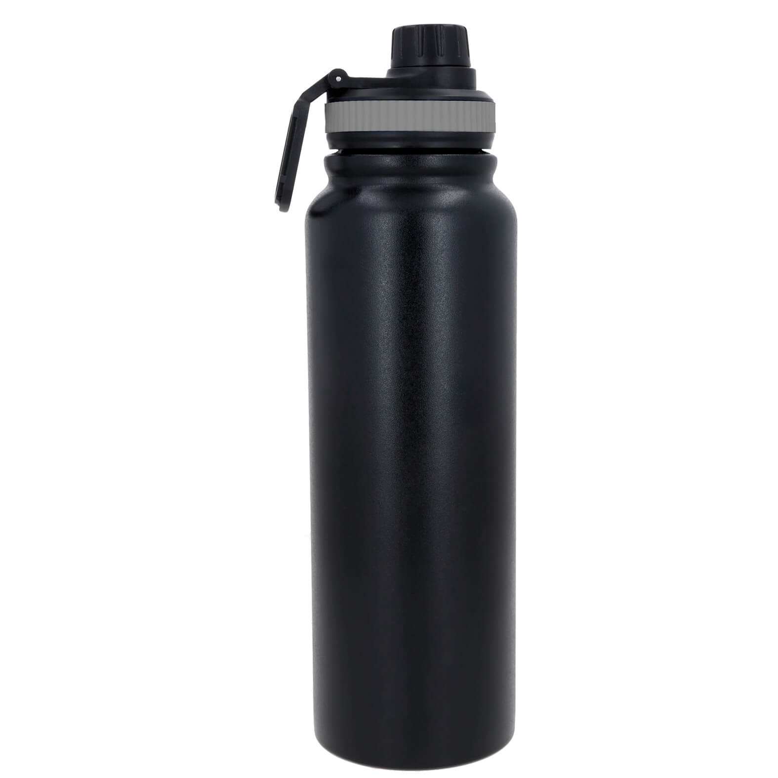 Termo de acero inoxidable de doble pared insulado al vacío con acabado rugoso. Cuenta con una tapa de rosca con asa para sujetarlo fácilmente.