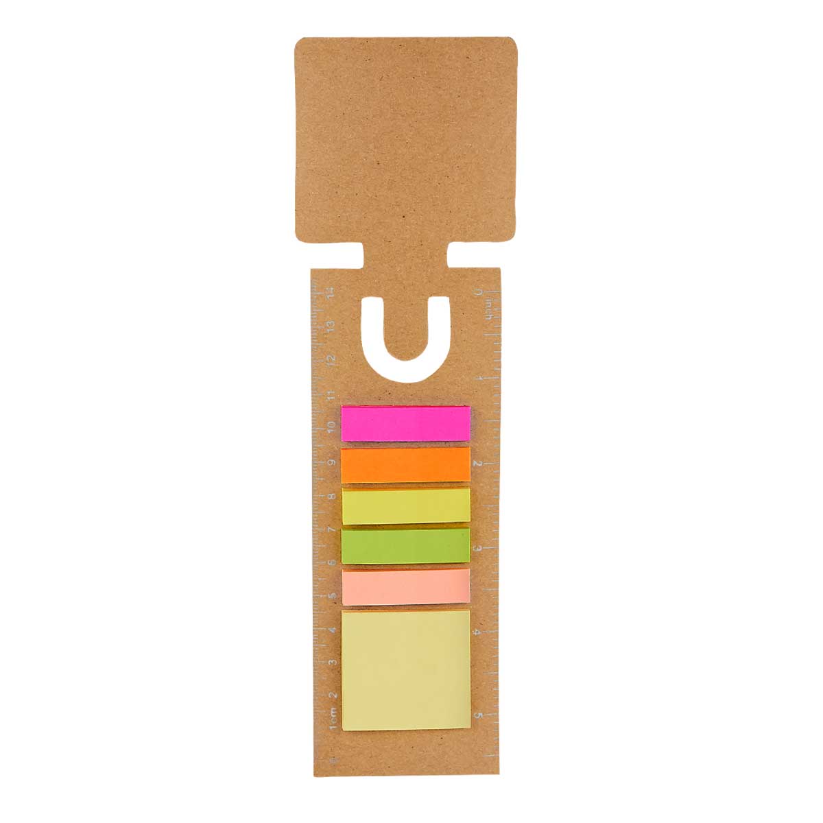 Incluye notas adheribles: 25 amarillas y banderillas de 5 colores. Regla de 14 cm impresa.