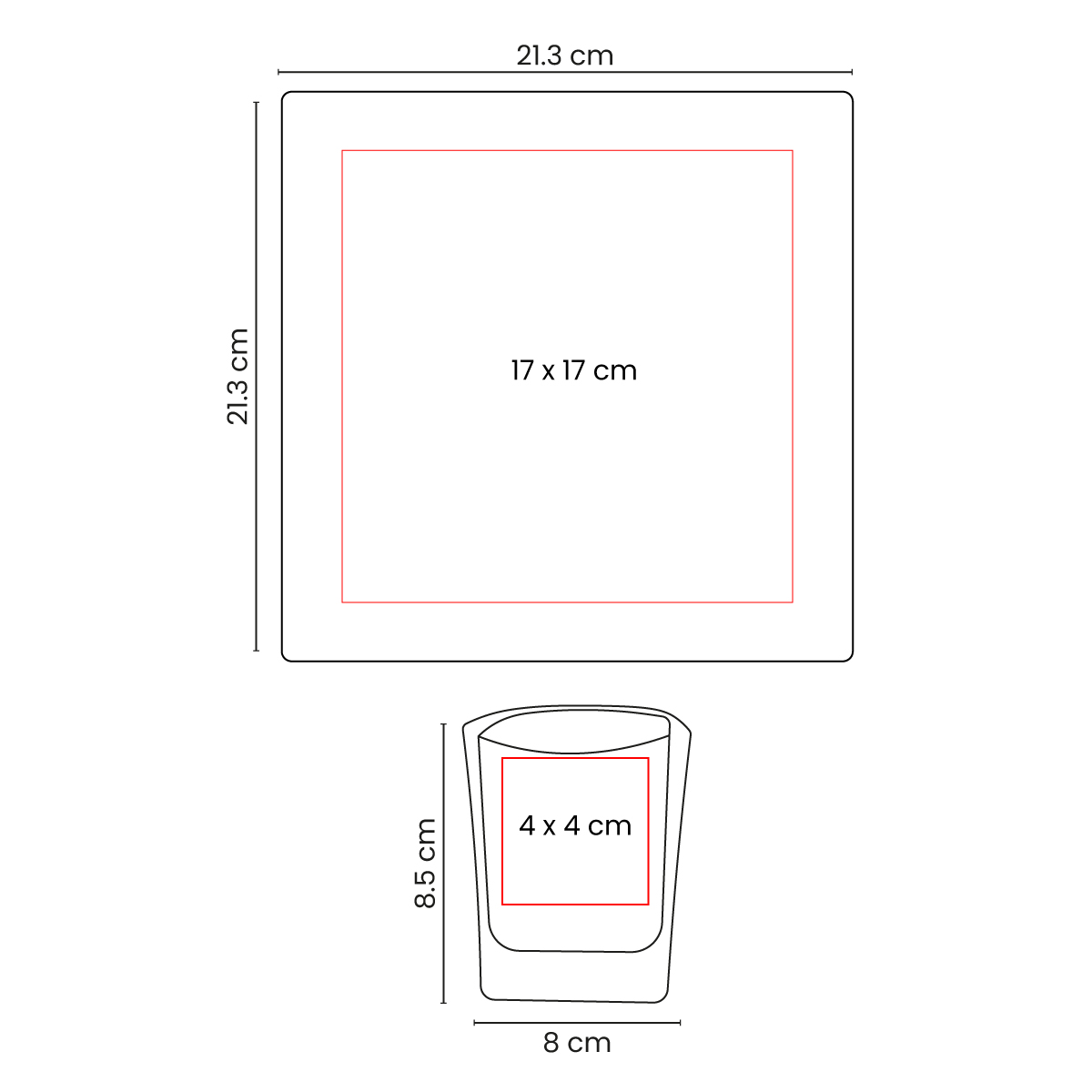 21.3 x 21.3 x 10 cm Estuche / 8 x 8.5 cm Vasos