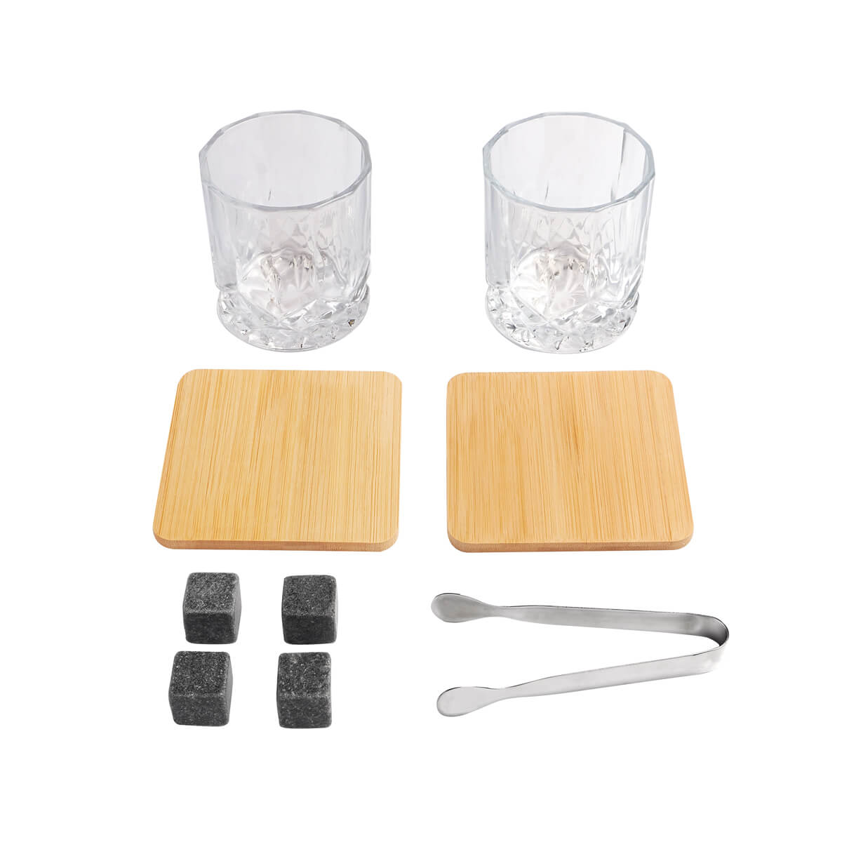 Set de bar con base de bambú. Incluye 2 vasos de cristal para whisky, 4 cubos enfriadores de granito, 2 portavasos de bambú y pinzas para hielo de acero inoxidable. Incluye caja individual.