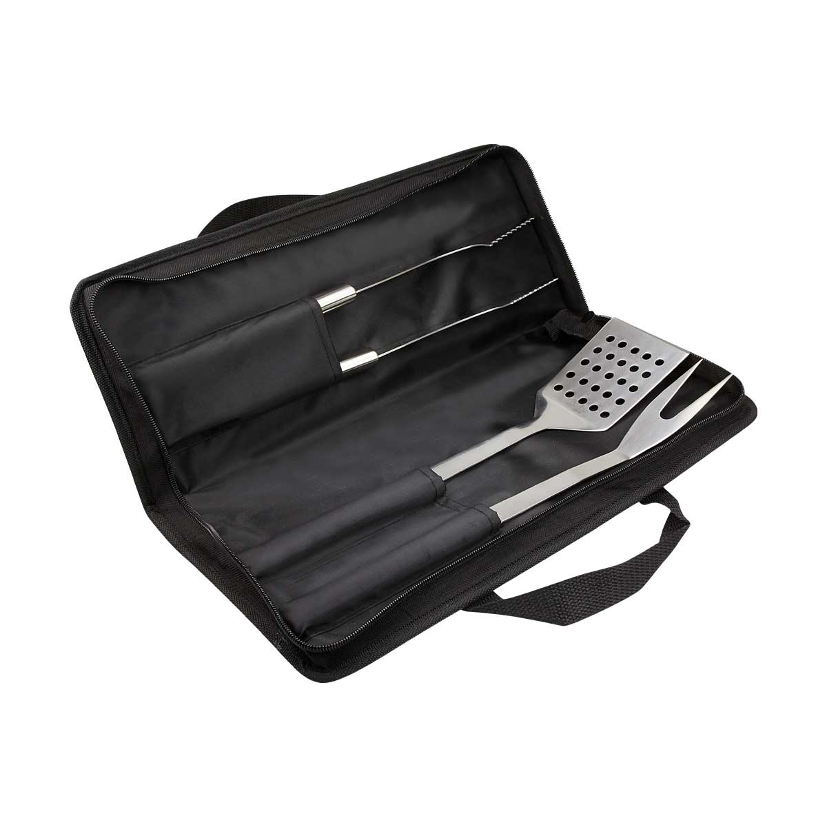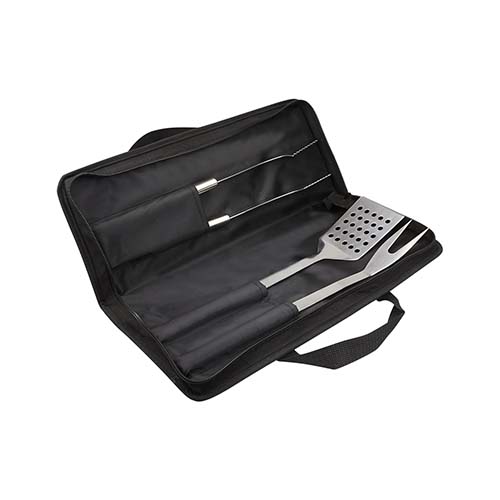 Maletín con cierre y asa. Incluye pinzas, tenedor y espátula.