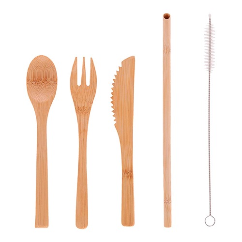 Set de cubiertos de bambú. Incluye tenedor, cuchara, cuchillo, popote, cepillo limpiador y bolsa con jareta.