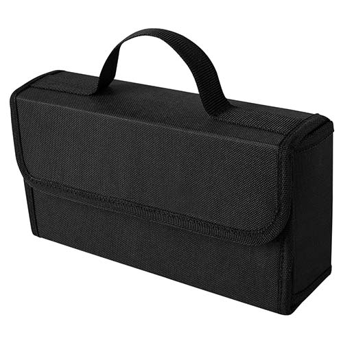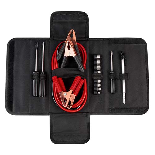 Contiene cables pasa corriente (100 amp), 9 dados, medidor de presión de aire, desarmador punta de cruz, desarmador punta plana, desarmador para dados. Incluye estuche de tela.