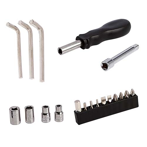 Contiene desarmador con 10 puntas diferentes e intercambiables, 3 llaves hexagonales, dado extensión y 4 dados. Incluye estuche de tela.