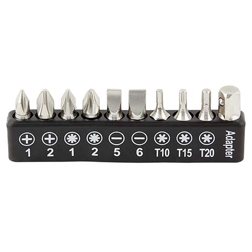 Contiene 2 desarmadores relojeros con 4 puntas distintas, dado extensión, desarmador con 10 puntas diferentes e intercambiables, 3 llaves hexagonales, pinzas de punta, flexómetro de 1m, cúter, lámpara desmontable con 13 LEDS, utiliza 3 baterías AAA (no incluidas) y correa ajustable con adaptador para lámpara. Incluye estuche.