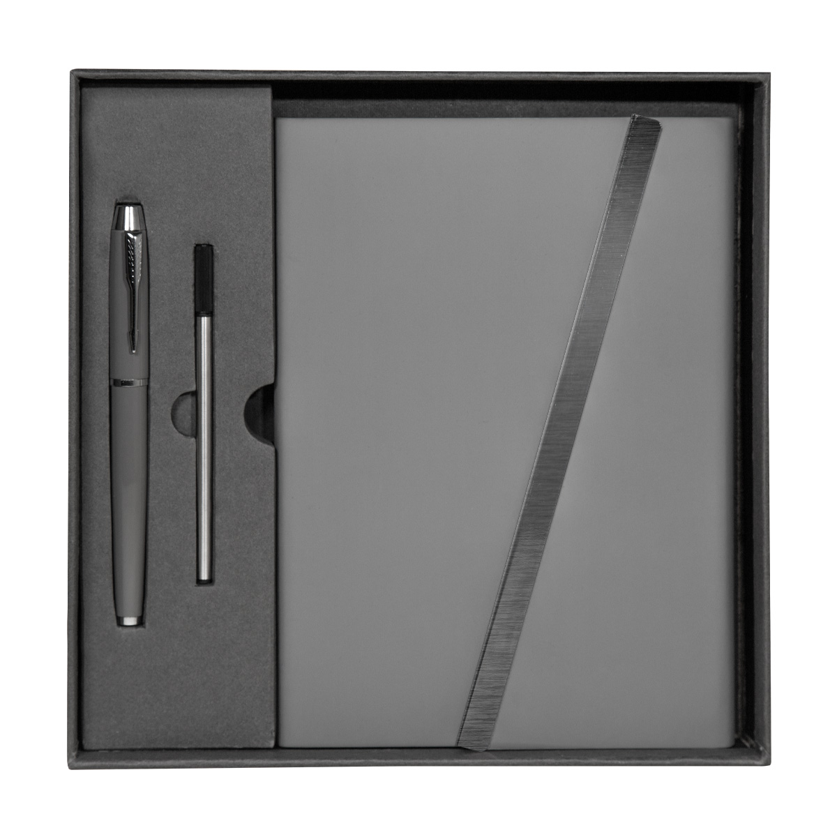 Set de regalo que incluye una libreta de 80 hojas a rayas, con pasta rígida y solapa magnética, un bolígrafo metálico y un repuesto de tinta adicional. Caja de regalo incluida.