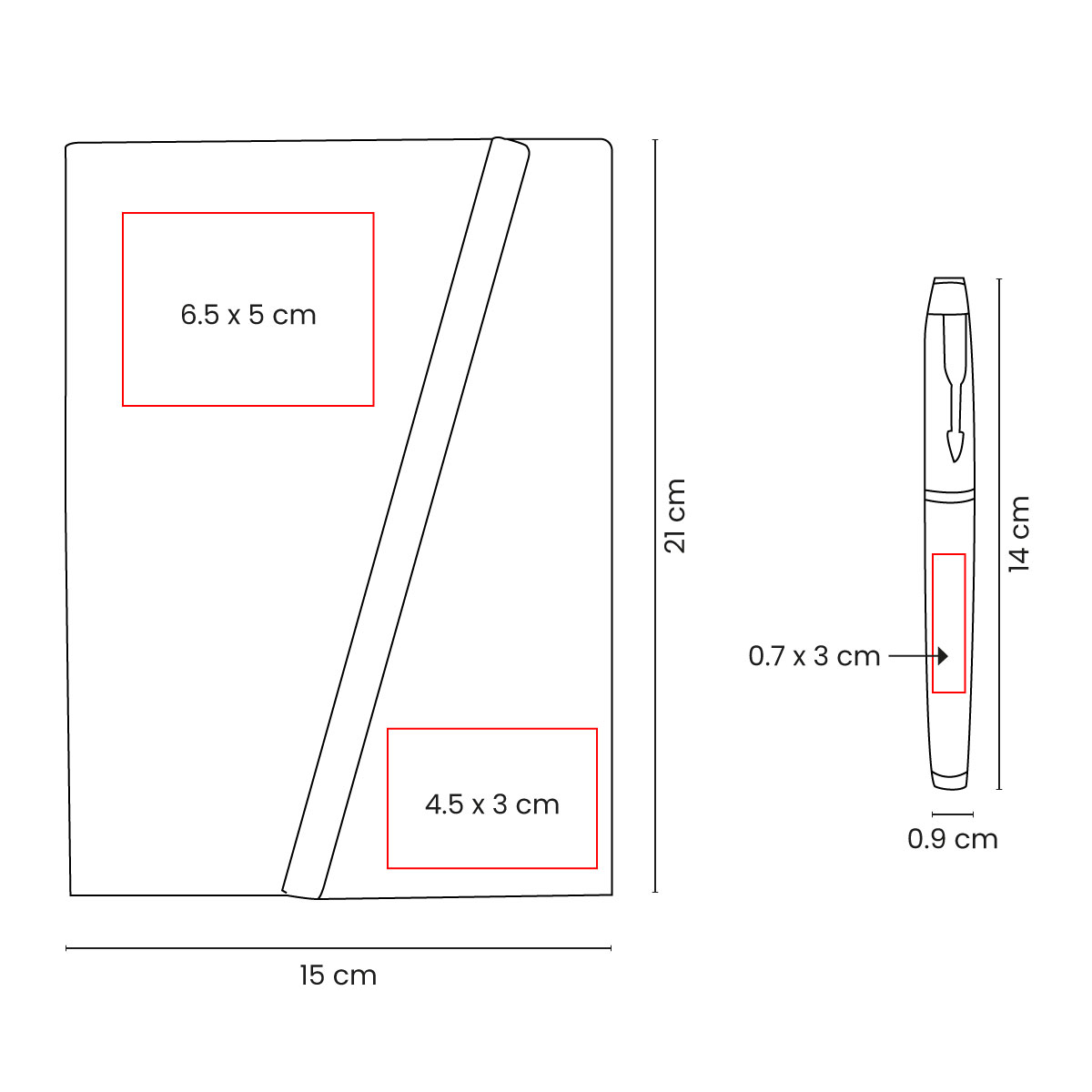 | Área de Impresión | 6.5 x 5 cm Portada superior / 4.5 x 3 cm Solapa / 3 x 0.7 cm Bolígrafo |