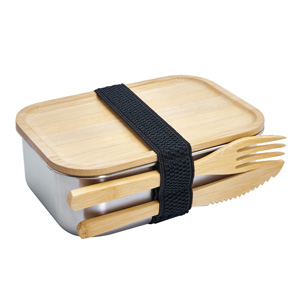 Set de lonchera metálica. Incluye contender de alimentos con tapa a presión y elástico para cerrar, 1 tenedor y 1 cuchillo. Termo con doble pared metálica, sellado al vacío, tapa con cierre de rosca y asa de metal. Producto no apto para microondas, ni lavavajillas. La madera es un producto natural el cual puede presentar variaciones en tonalidades y vetas. Este producto por ser últimas piezas puede presentar alguna variación, no se aceptan devoluciones.