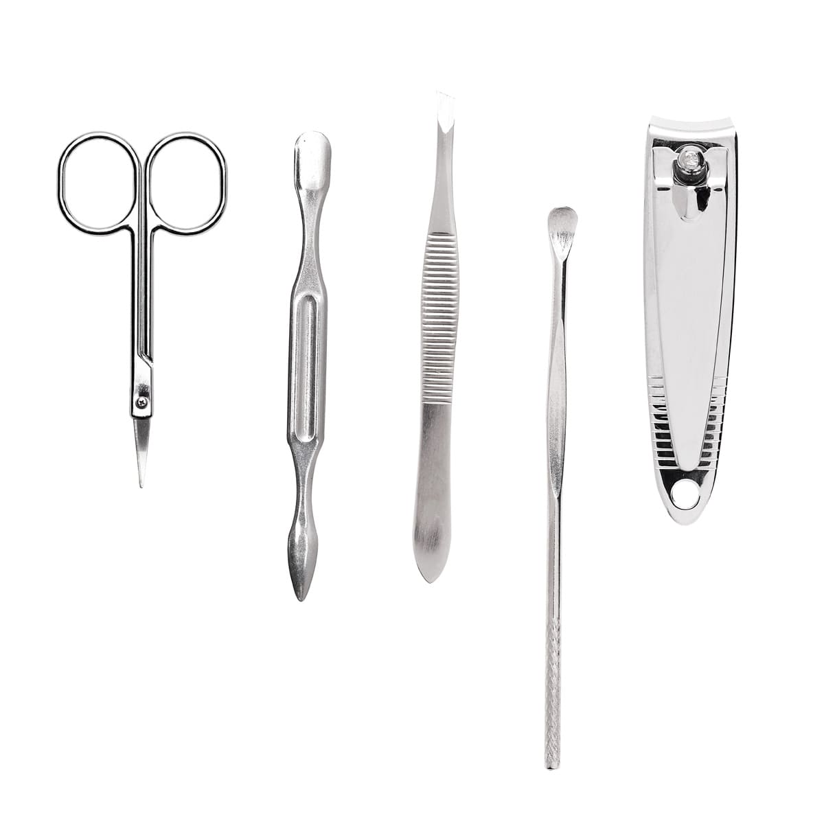 Set de manicure. Cuenta con sobre de curpiel con botón metálico. Incluye 6 piezas para un manicure básico: cortaúñas, tijeras curva para uñas, lima de uñas, empujador de cutícula, limpia uñas y pinza para cejas.