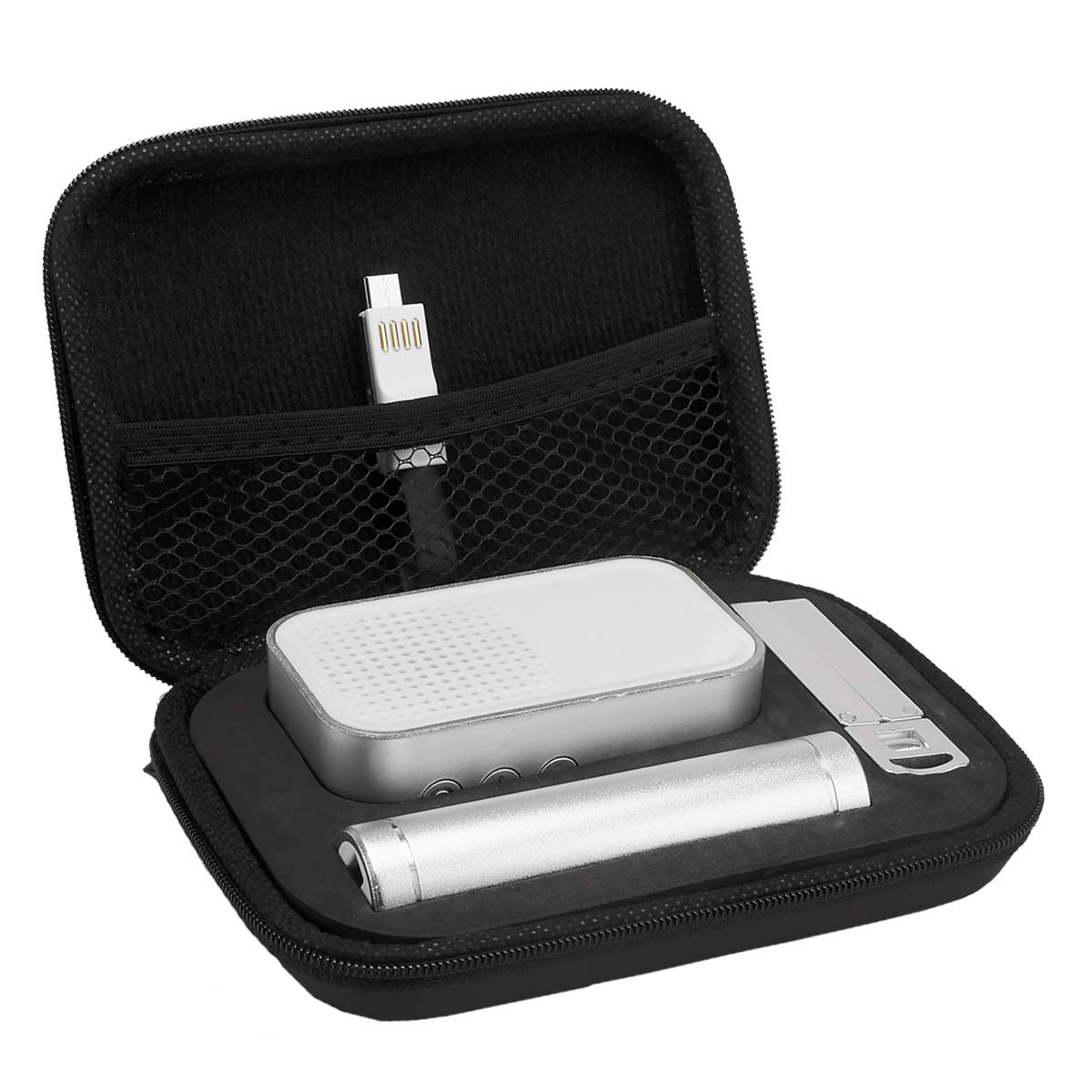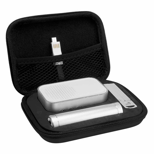Incluye bocina bluetooth, batería auxiliar de 2,600 mAh, cable cargador y de transferencia de datos compatible con micro USB, 8 pin y tipo C, soporte para smartphone y estuche. Este producto por ser últimas piezas puede presentar alguna variación, no se aceptan devoluciones.