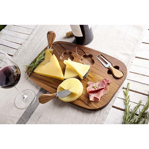 Set con 1 tabla, 2 cuchillos y 1 tenedor para quesos. Incluye caja individual. La madera es un producto natural el cual puede presentar variaciones en tonalidades y vetas.