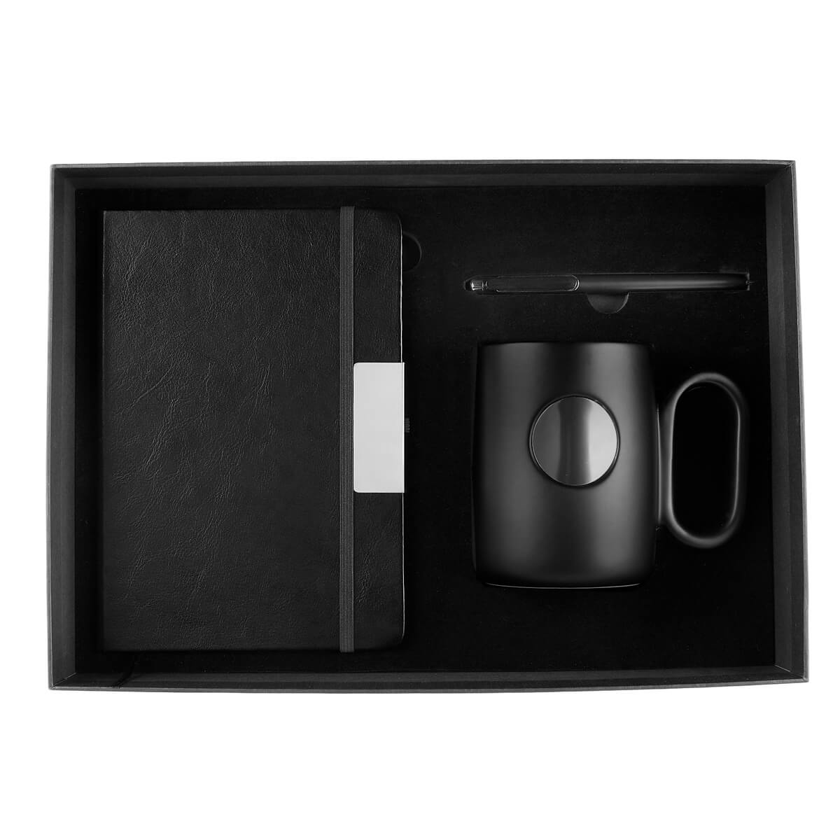 Set de regalo ejecutivo de 3 piezas. Contiene libreta de pasta dura con 80 hojas recicladas a raya y placa metálica. Incluye listón separador y elástico porta bolígrafo. Bolígrafo de plástico con mecanismo pulsador y taza de carámica con placa metálica circular. Capacidad de 473 ml. Incluye caja de regalo rígida.