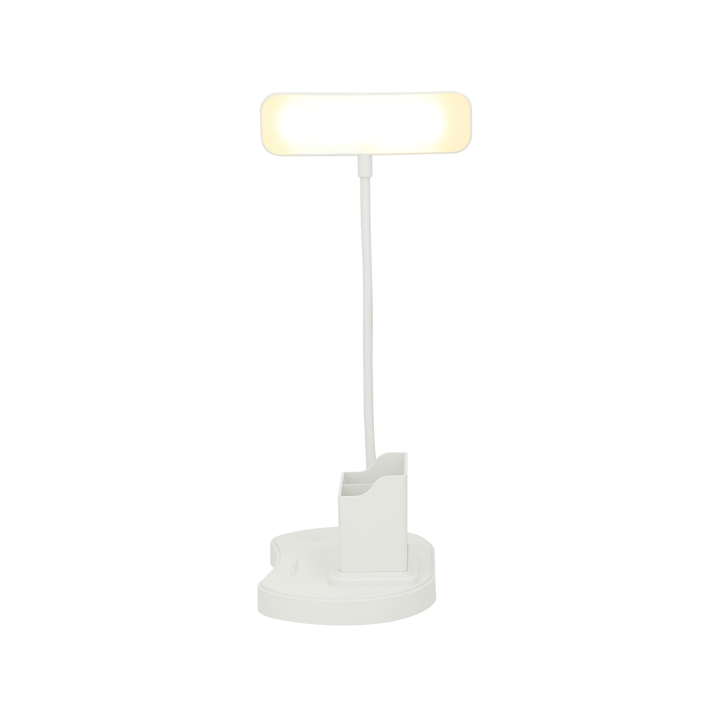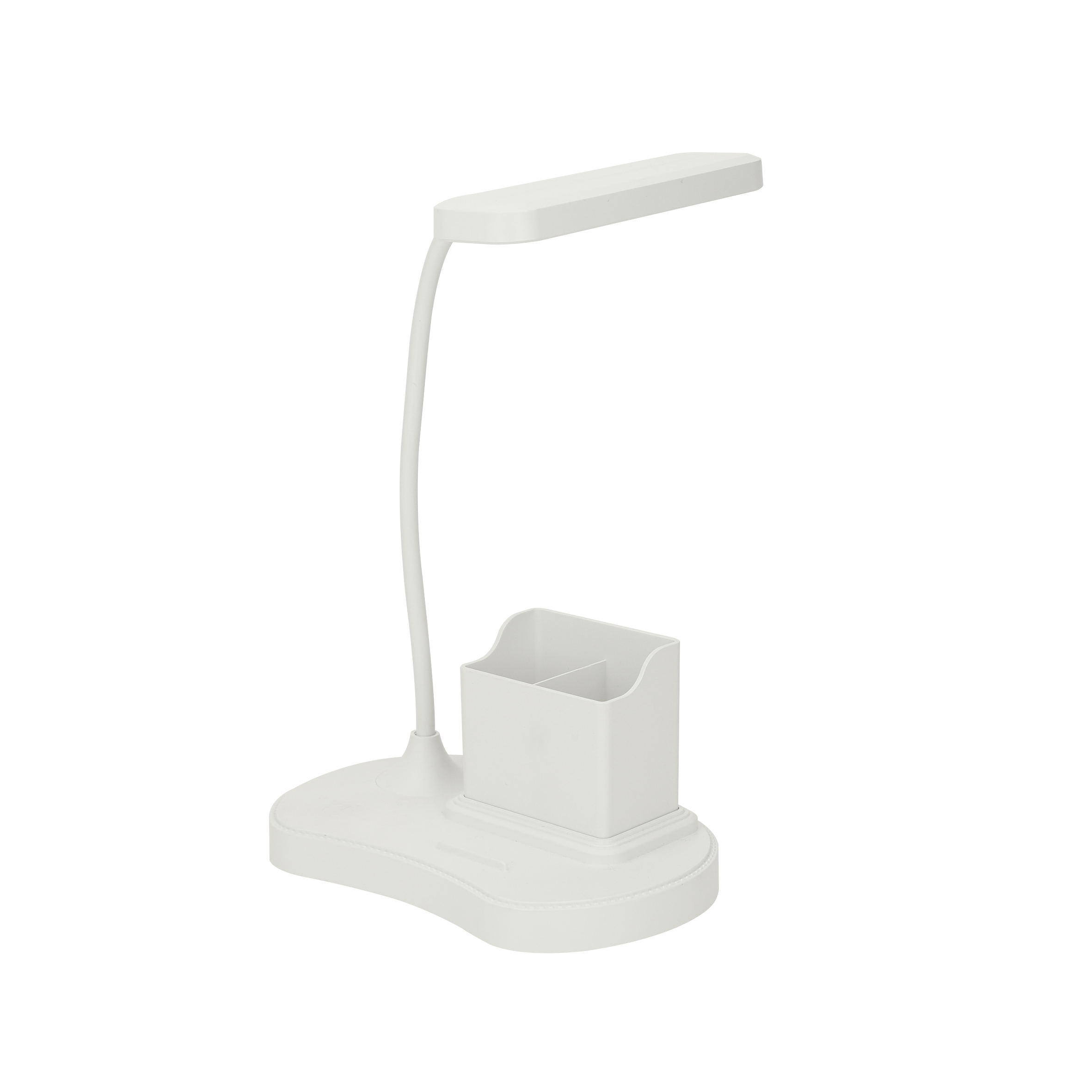 Lámpara para escritorio con multi organizador, luz cálida y blanca, soporte para celular y potencia de 4w. Incluye cable para conexión.
