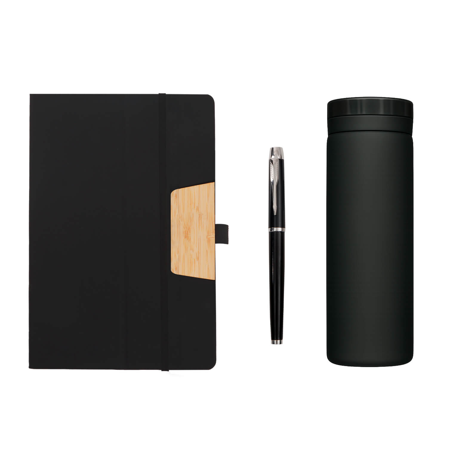 Set ejecutivo incluye: libreta de poliuretano con portada que sirve como soporte de celular, bolígrafo y termo con acabado rubber de 300 ml.