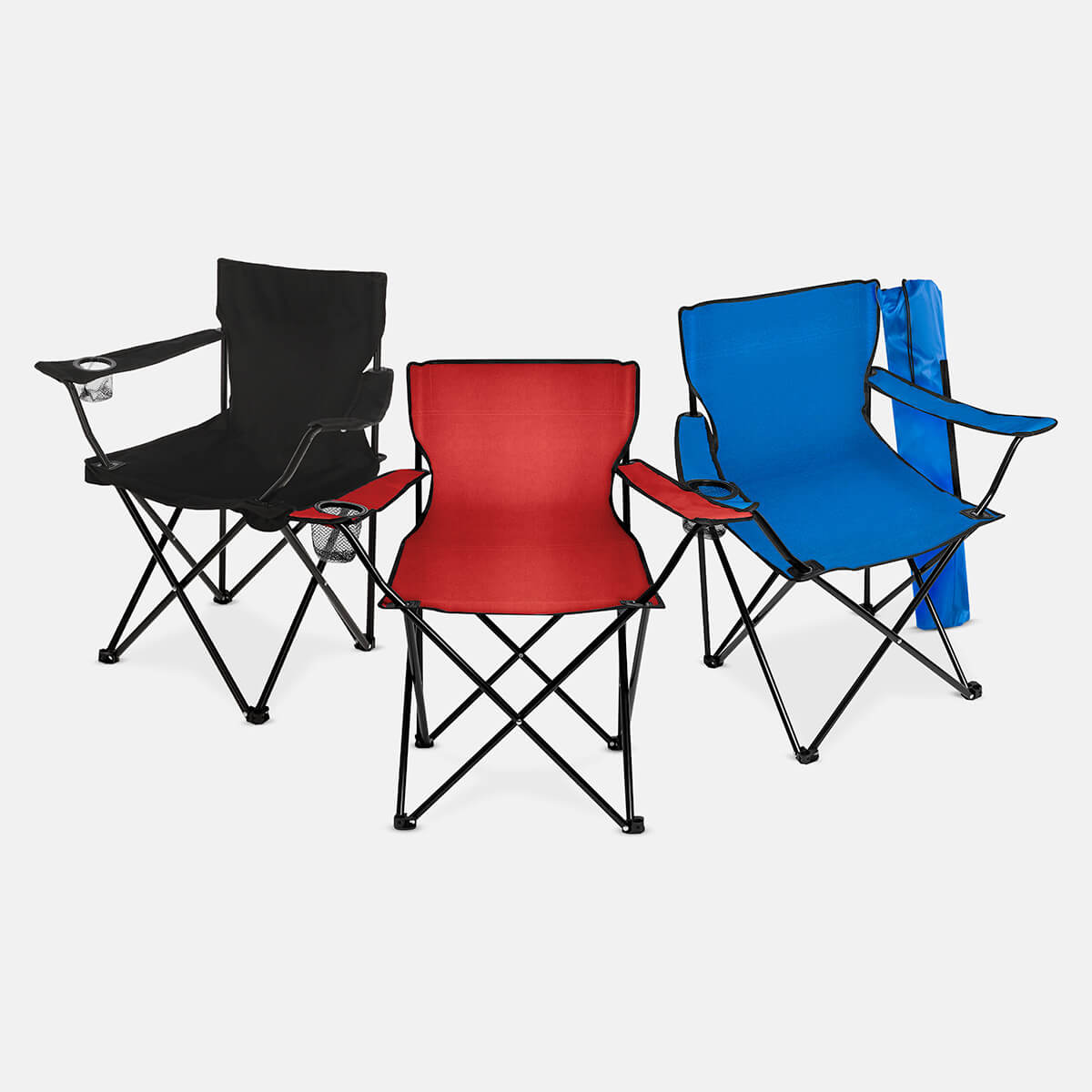 Silla plegable de fácil armado con reposabrazos, porta vasos de malla y funda con jareta y correa.