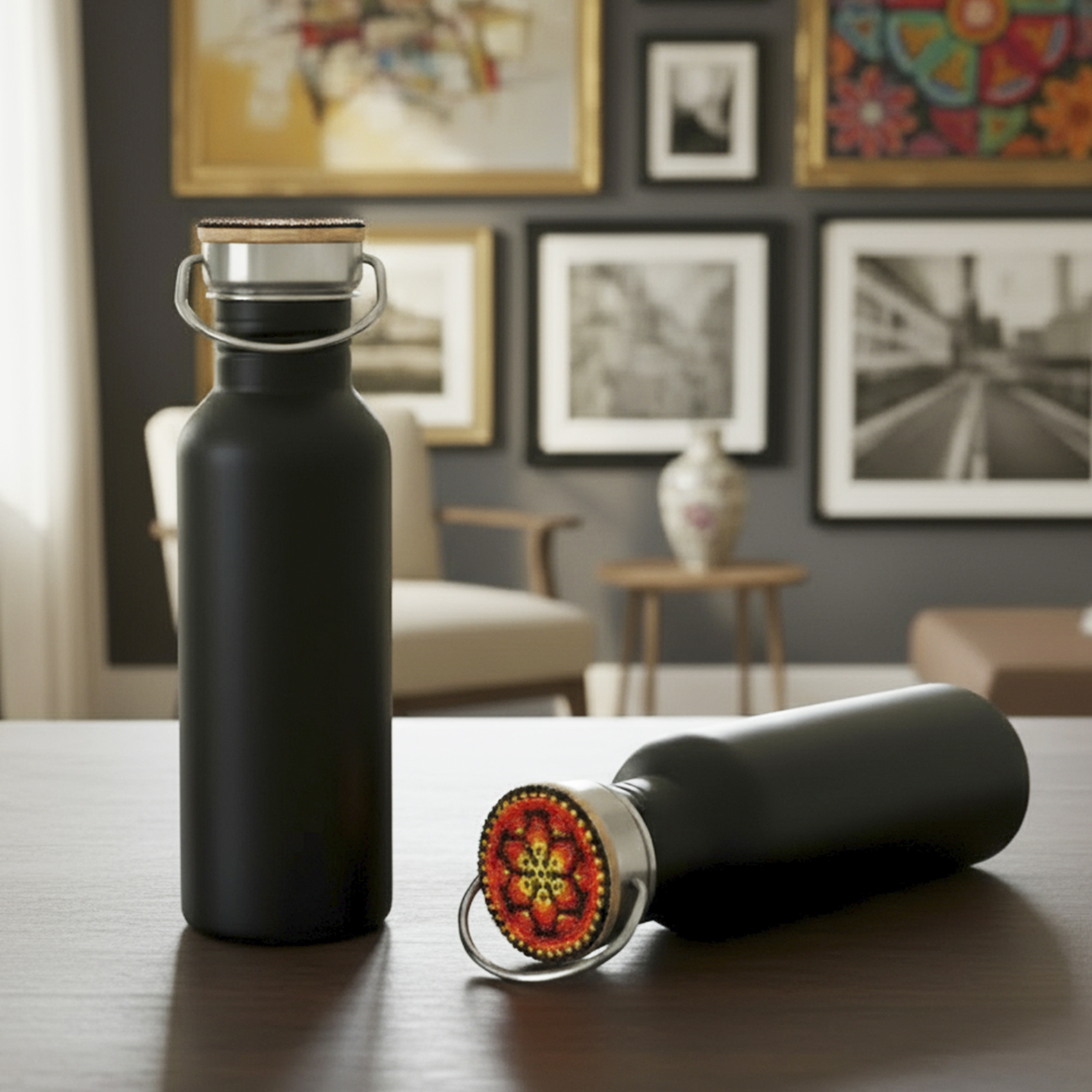 Cilindro de acero inoxidable con tapa de bambú, decorada con arte huichol. Cada pieza está elaborada a mano con 820 chaquiras colocadas una a una por artesanos de Jalisco. Con cada compra apoyas el trabajo que representa el sustento económico de estas familias artesanas.