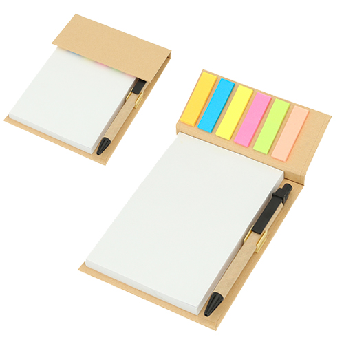 Block de notas ecológico con 100 hojas blancas, notas adhesivas y bolígrafo.
