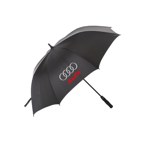 Paraguas circular pongee con sistema de apertura automático, 8 gajos, varillas reforzadas, eje central de fibra de carbono y mango de EVA. Incluye funda con agarradera.