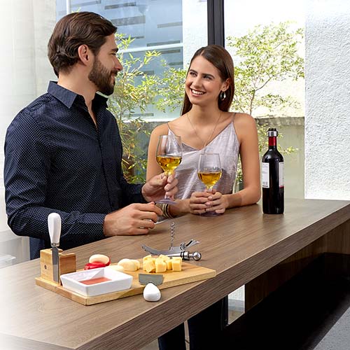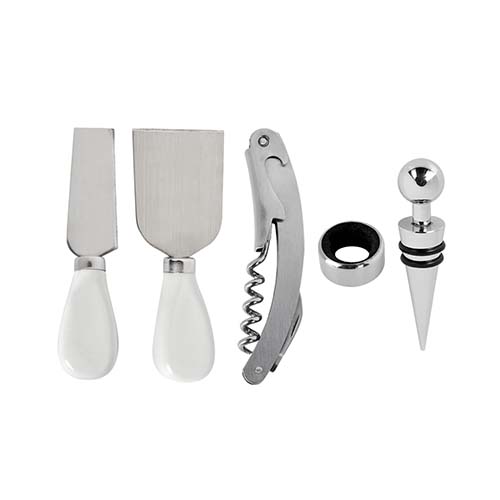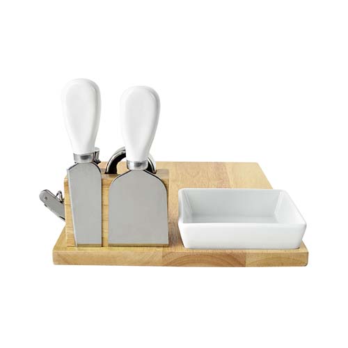 Set de madera con 1 tabla con base imantada, 2 cuchillos para quesos, 1 plato, 1 sacacorchos con navaja, 1 stopper y 1 arillo. La madera es un producto natural el cual puede presentar variaciones en tonalidades y vetas.