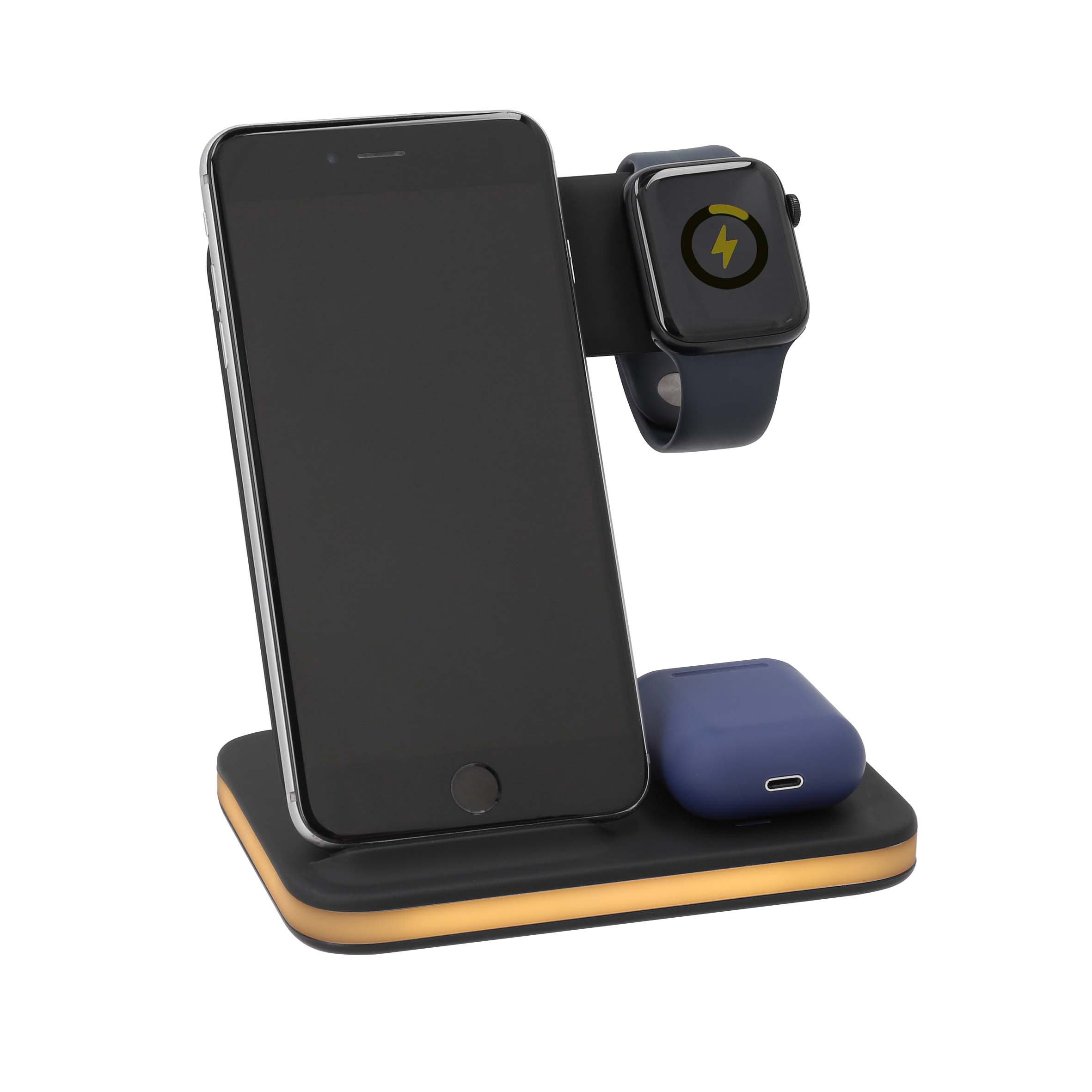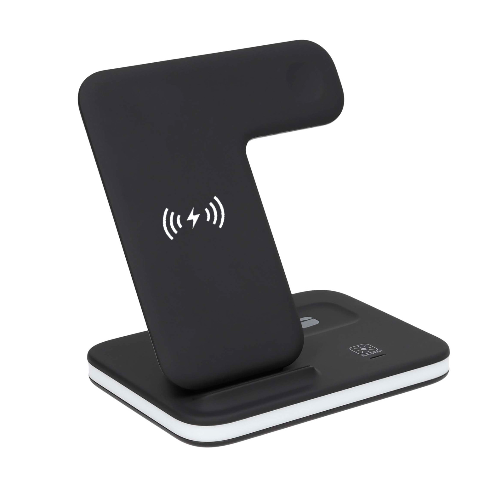 Multicargador inalámbrico para smartphone, audífonos inalámbricos, reloj inteligente y lámpara en la base, 4 en 1. Incluye cable con conector tipo C. (Compatible para dispositivos con tecnología Qi).