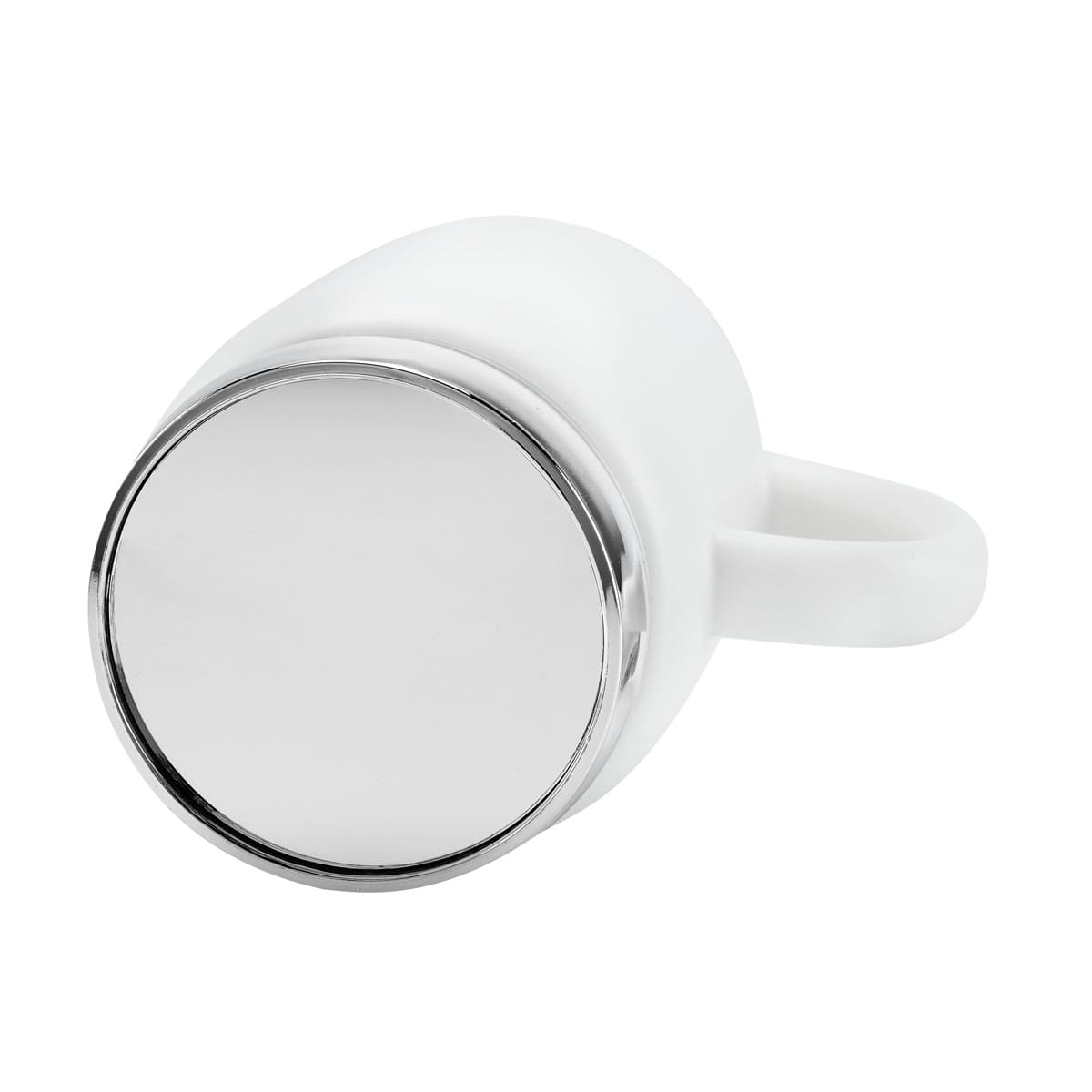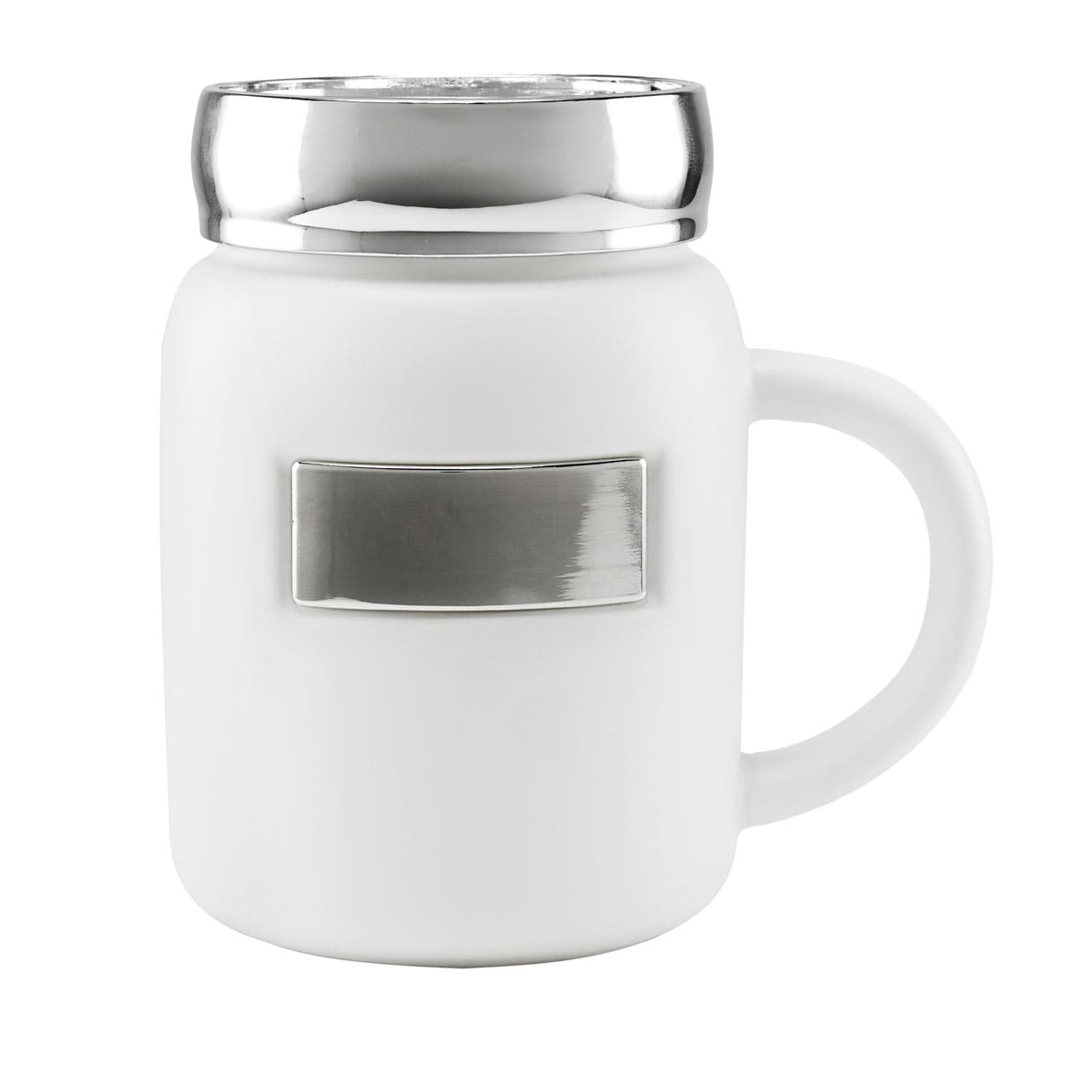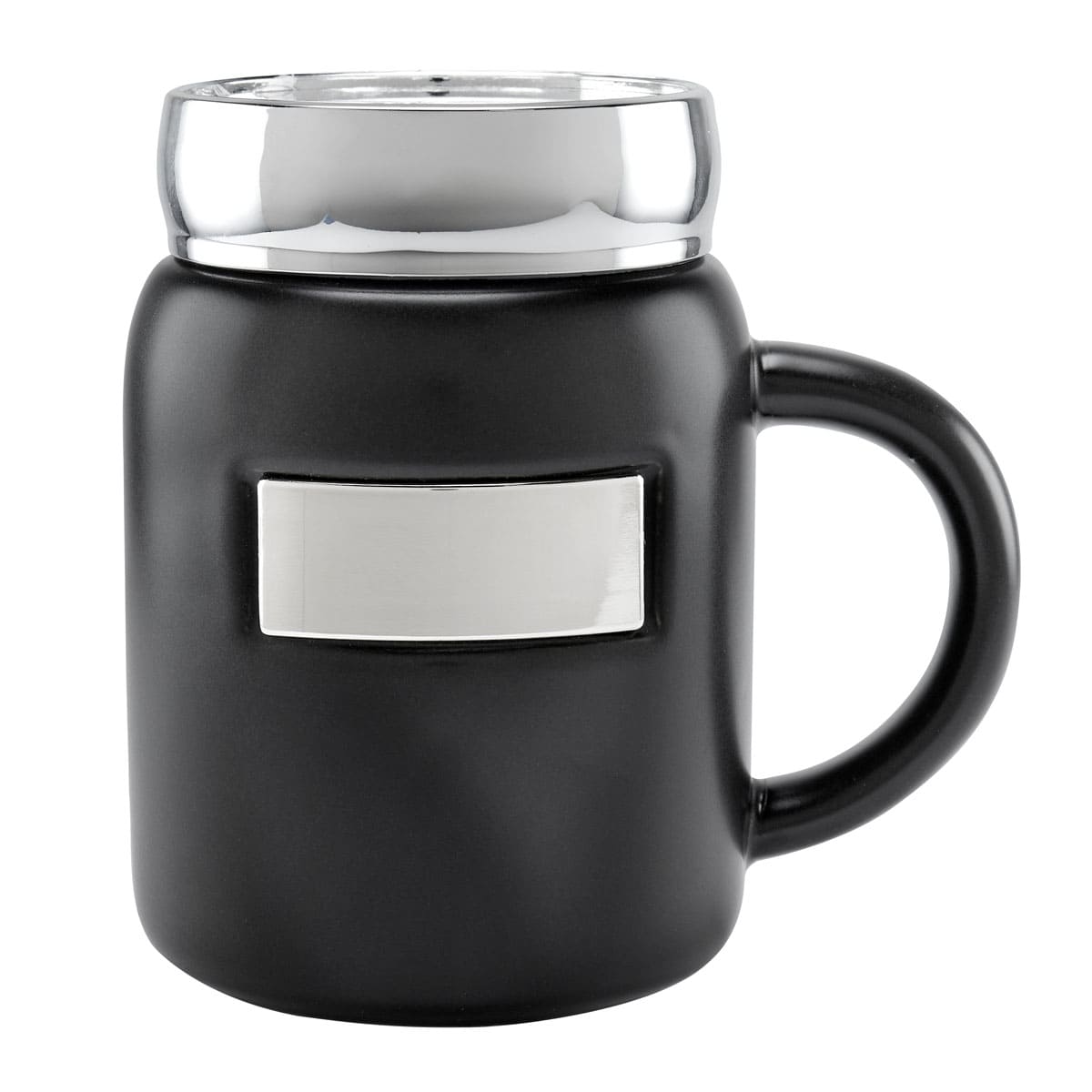 Taza tarro de cerámica con placa metálica para impresión. Tapa de rosca de plástico con recubrimiento metalizado. Terminado mate. Incluye caja individual.