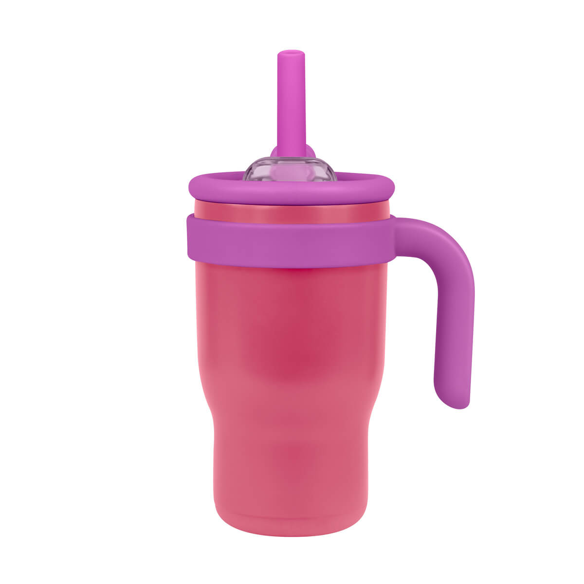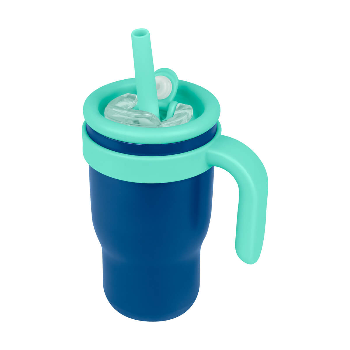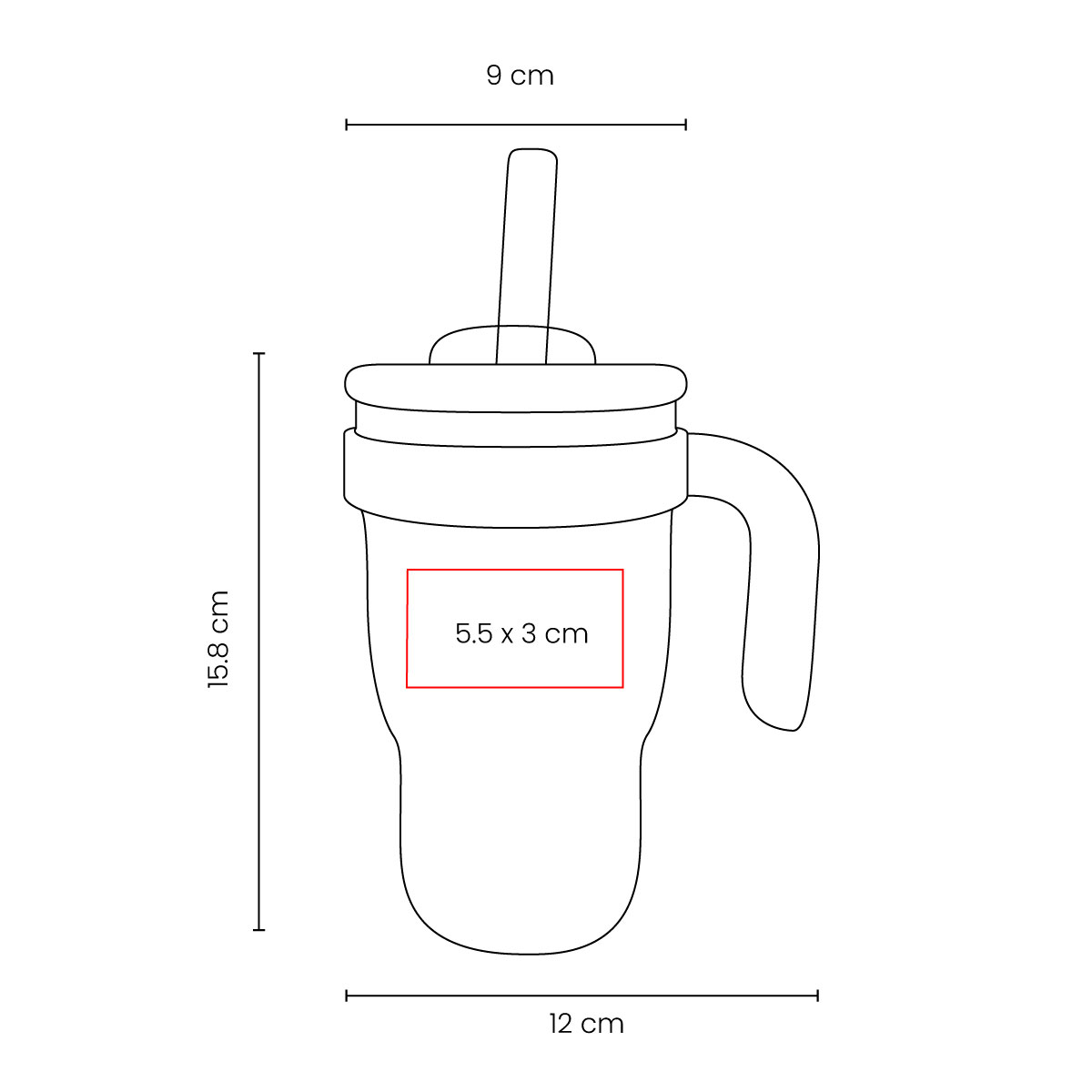 Termo doble pared. Cerrado al vacío. Pared interna y externa de acero inoxidable. Tapa de plástico con cierre de rosca que le aporta mayor seguridad. Cuenta con dos funcionalidades en la tapa, boquilla para beber con sobre tapa push y ranura para popote con sobre tapa adicional. Popote con boquilla de silicón, avanzado sistema de cierre anti derrames y asa de plástico. Su práctico tamaño, te permitirá transportarlo fácilmente a cualquier lugar. Ideal para niños y adultos. Mantiene temperatura caliente 6 hrs y fría 8 hrs. Capacidad de 15 Oz. Base de 6.5 cm de diámetro. Incluye cuerpo con terminado rugoso y caja individual.