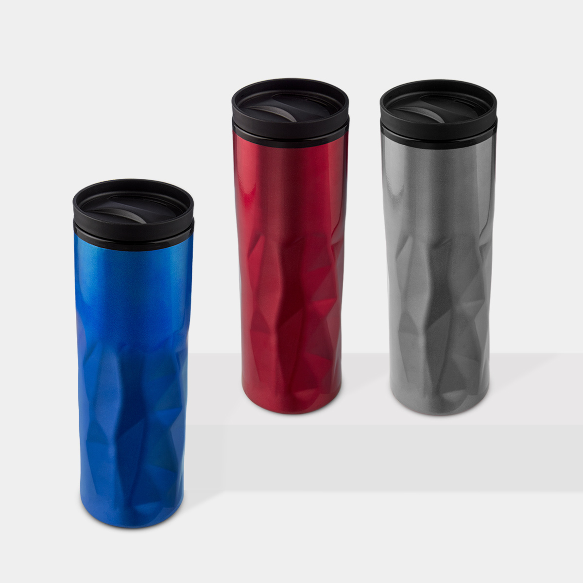 Doble pared. Pared interna plástico, pared externa acero inoxidable. Cuerpo prismático. Tapa de plástico con válvula de seguridad. Incluye caja individual.