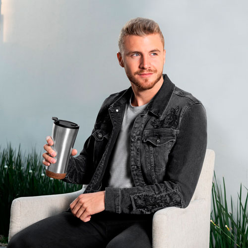 Doble pared. Pared interna plástico, pared externa acero inoxidable. Base de corcho. Tapa en dos posiciones. No usar en microondas ni lavavajillas. Incluye caja individual.