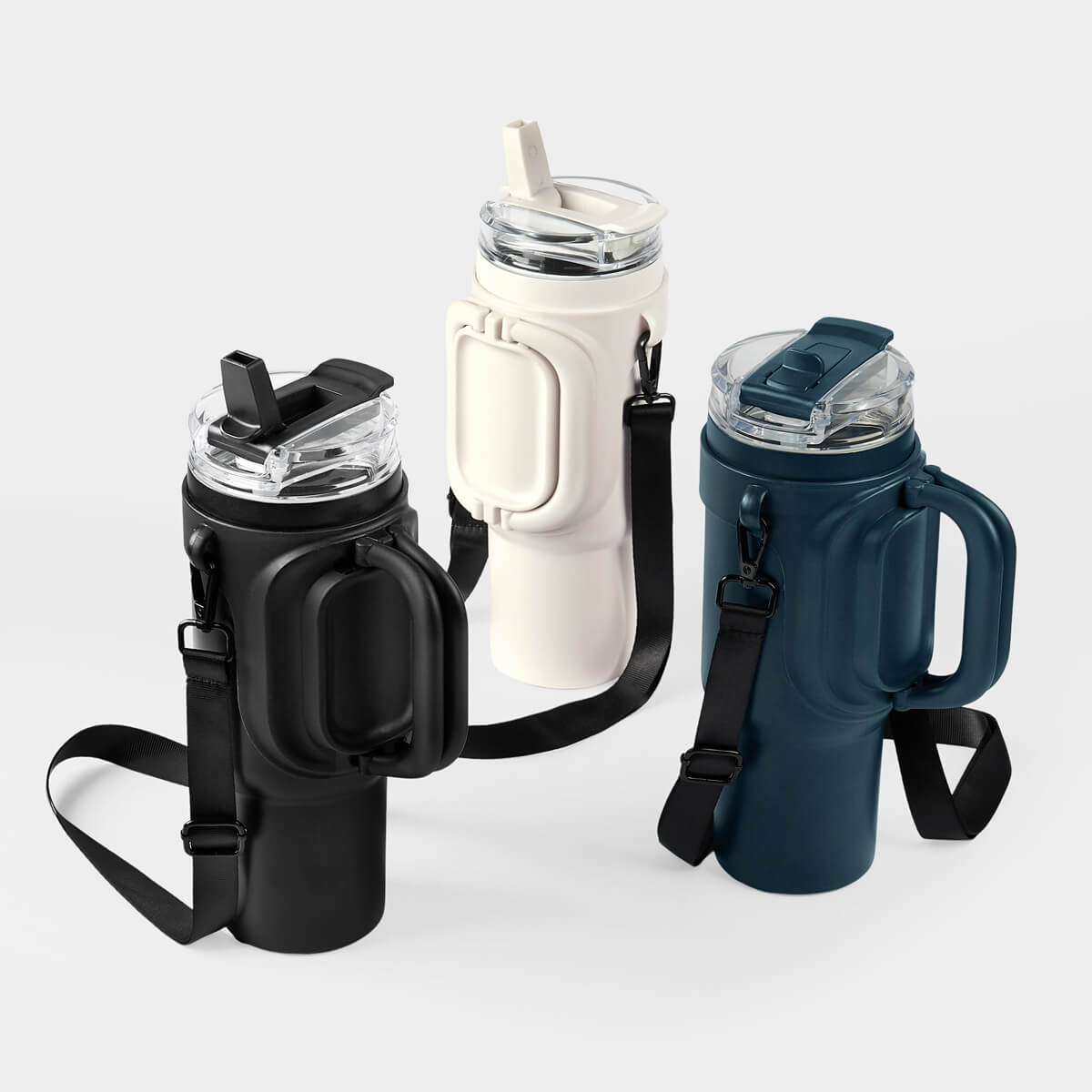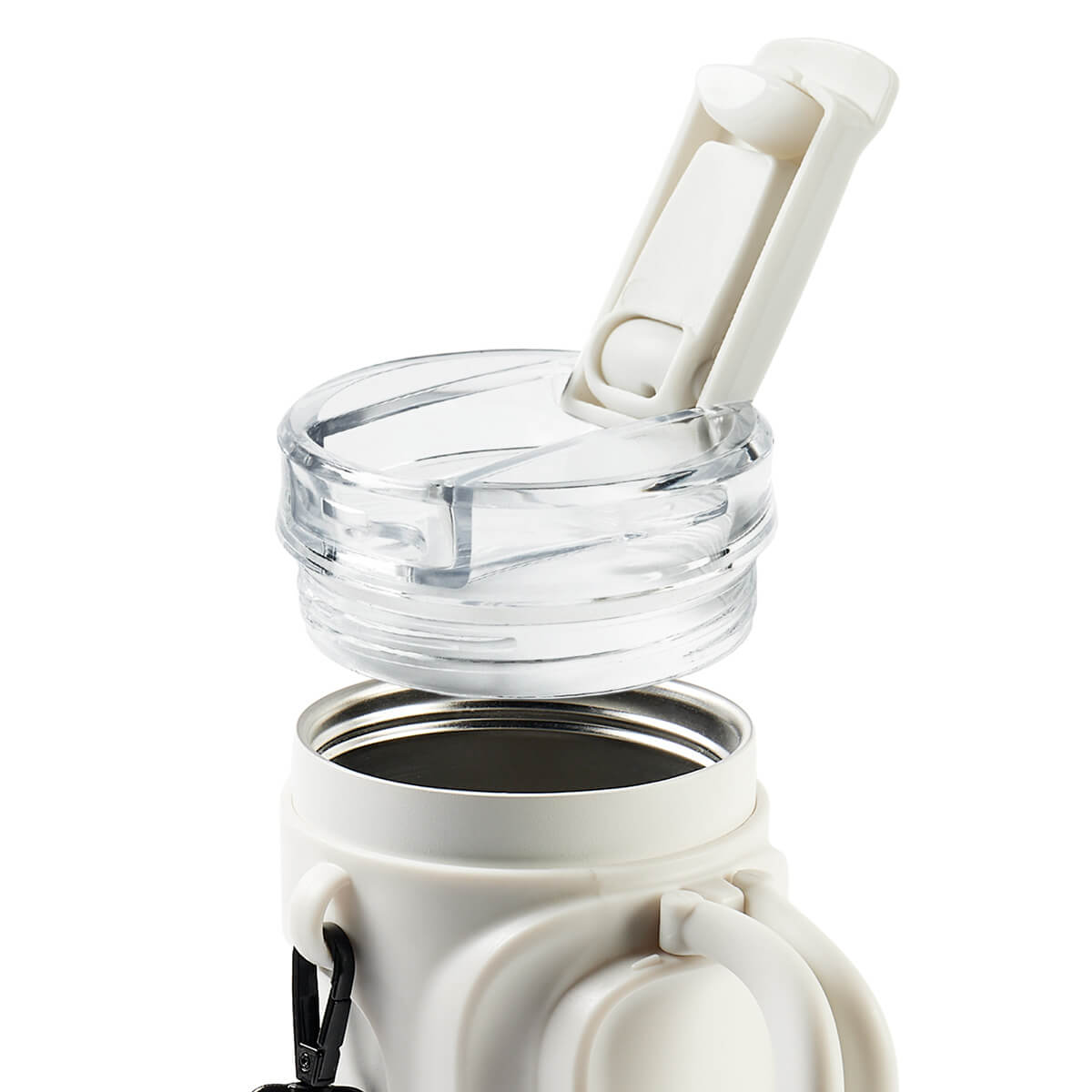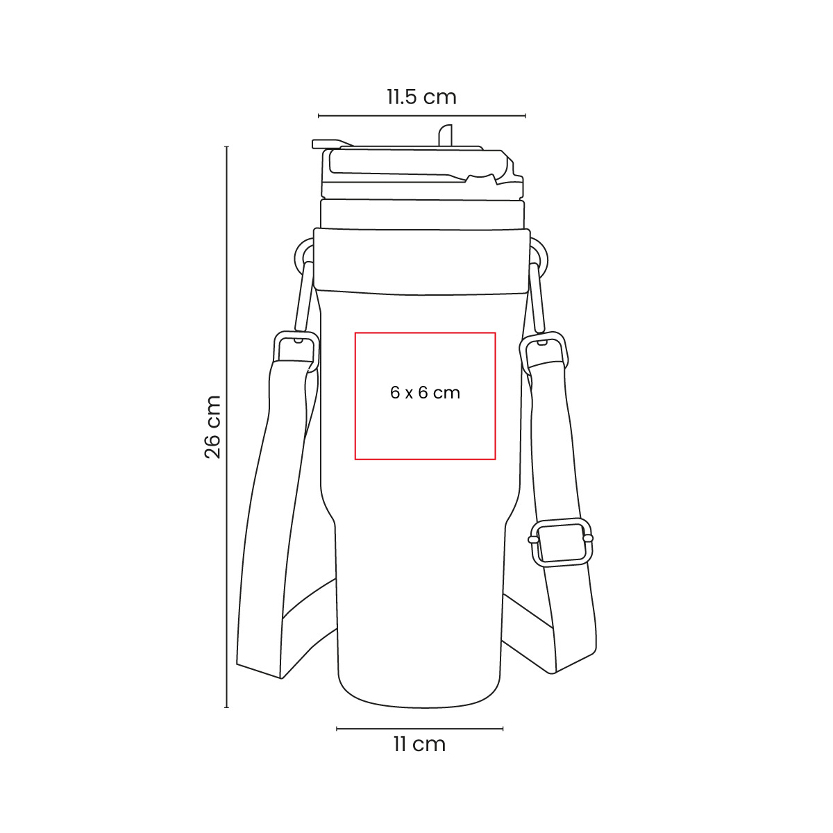 Termo doble pared. Cerrado al vacío. Pared interna y externa de acero inoxidable. Terminado rugoso que facilita su agarre. Incluye tapa de plástico con sistema de rosca y la sobretapa mulitfuncional, permite beber por medio de su boquilla clásica o a través de su boquilla plegable con popote. Su diseño innovador incorpora un asa plegable para un uso más práctico y un asa para hombro ajustable y removible, con broches metálicos. Mantiene las bebidas calientes hasta por 6 hrs y frías hasta por 8 hrs. Capacidad de 30 Oz. Base de 7.4 cm de diámetro. Incluye caja individual.