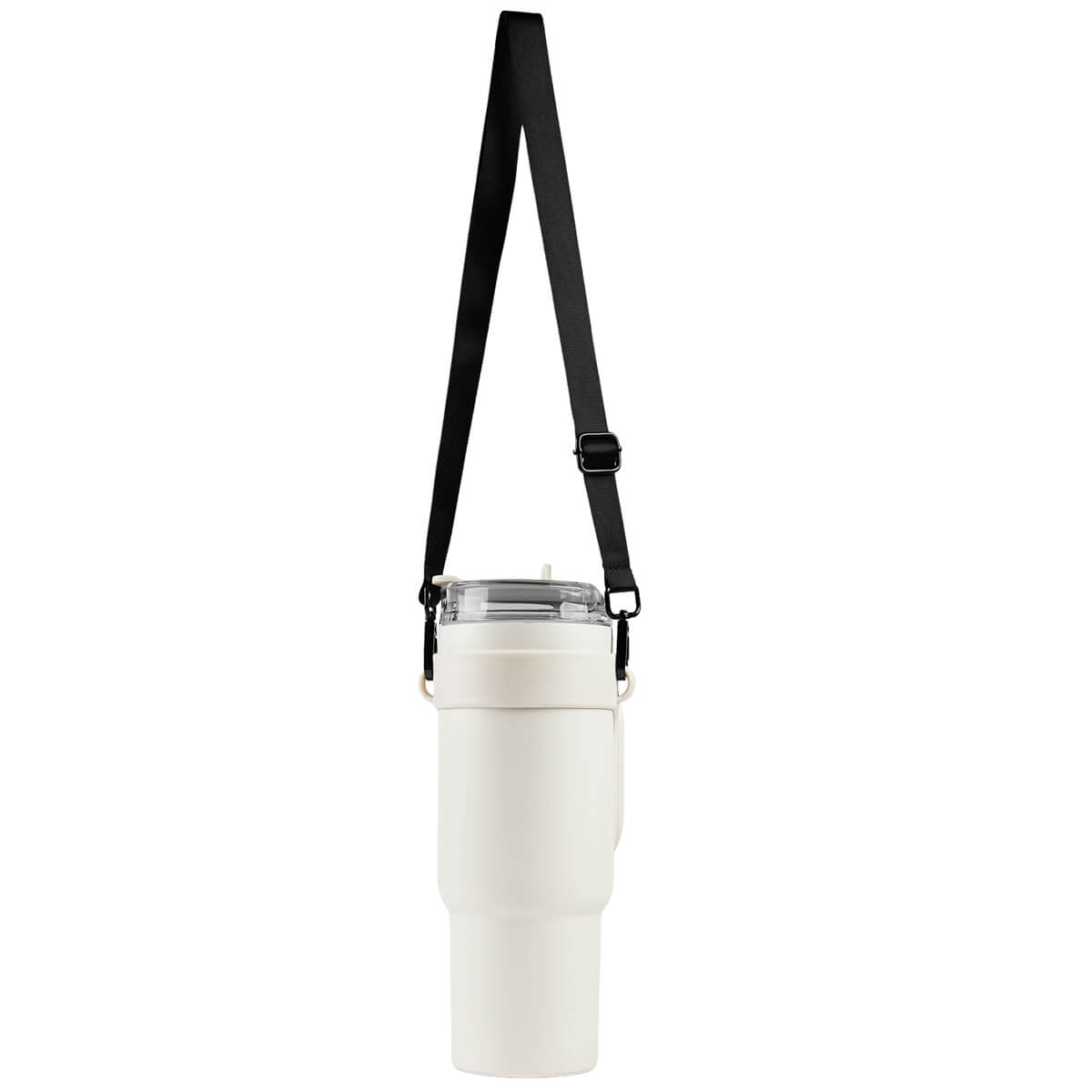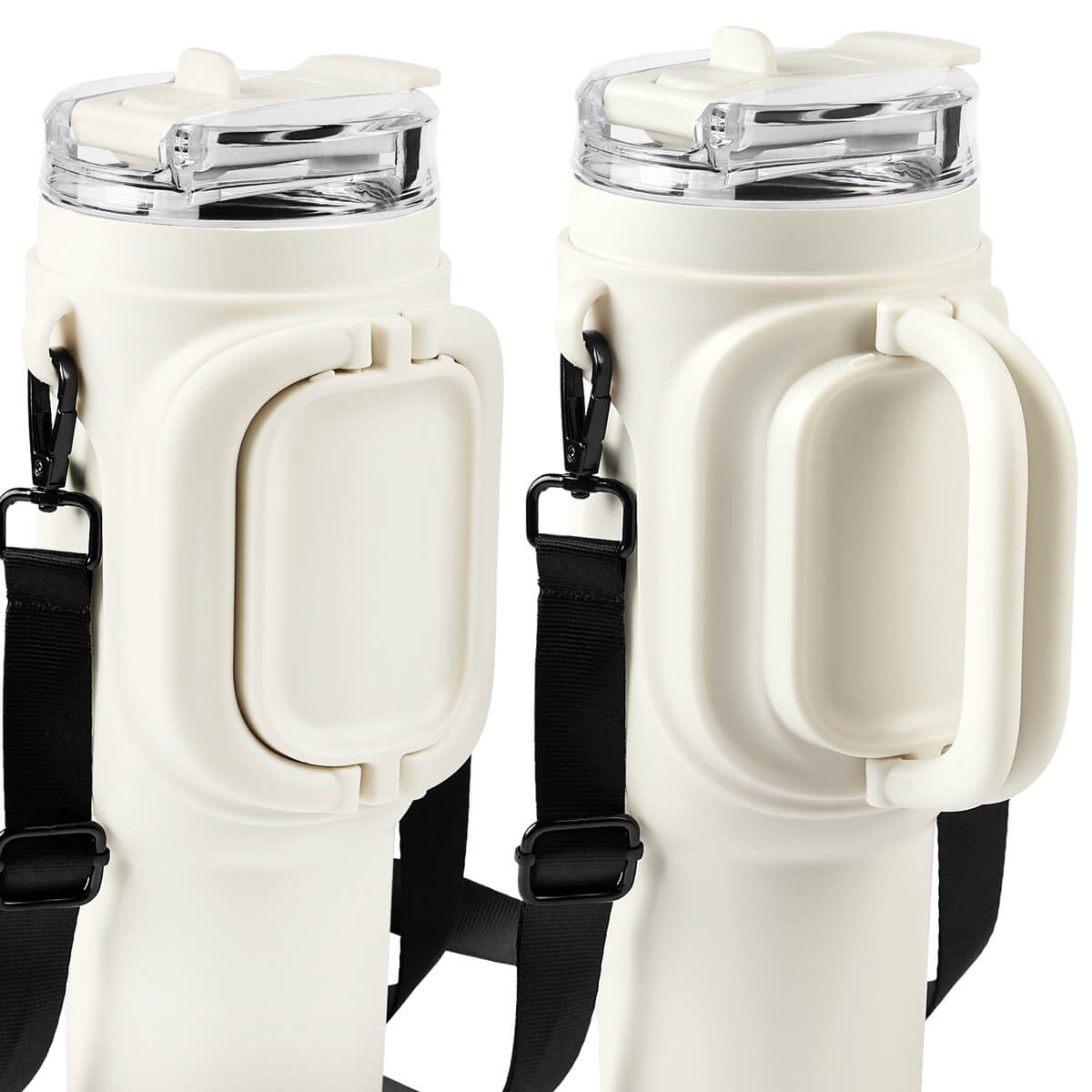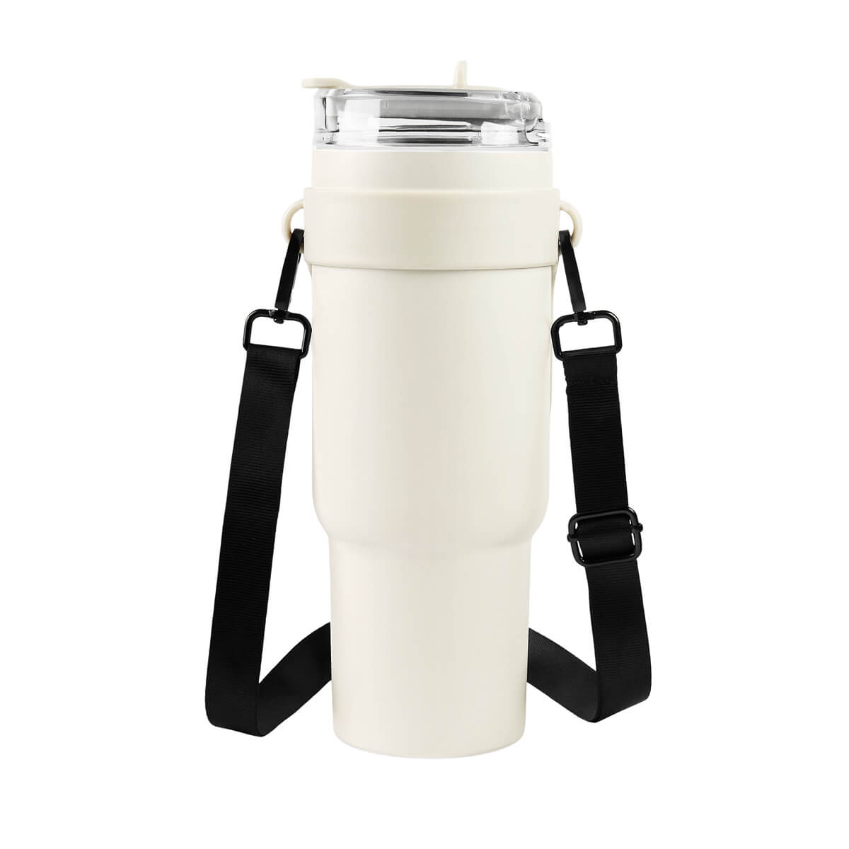 Termo doble pared. Cerrado al vacío. Pared interna y externa de acero inoxidable. Terminado rugoso que facilita su agarre. Incluye tapa de plástico con sistema de rosca y la sobretapa mulitfuncional, permite beber por medio de su boquilla clásica o a través de su boquilla plegable con popote. Su diseño innovador incorpora un asa plegable para un uso más práctico y un asa para hombro ajustable y removible, con broches metálicos. Mantiene las bebidas calientes hasta por 6 hrs y frías hasta por 8 hrs. Capacidad de 30 Oz. Base de 7.4 cm de diámetro. Incluye caja individual.