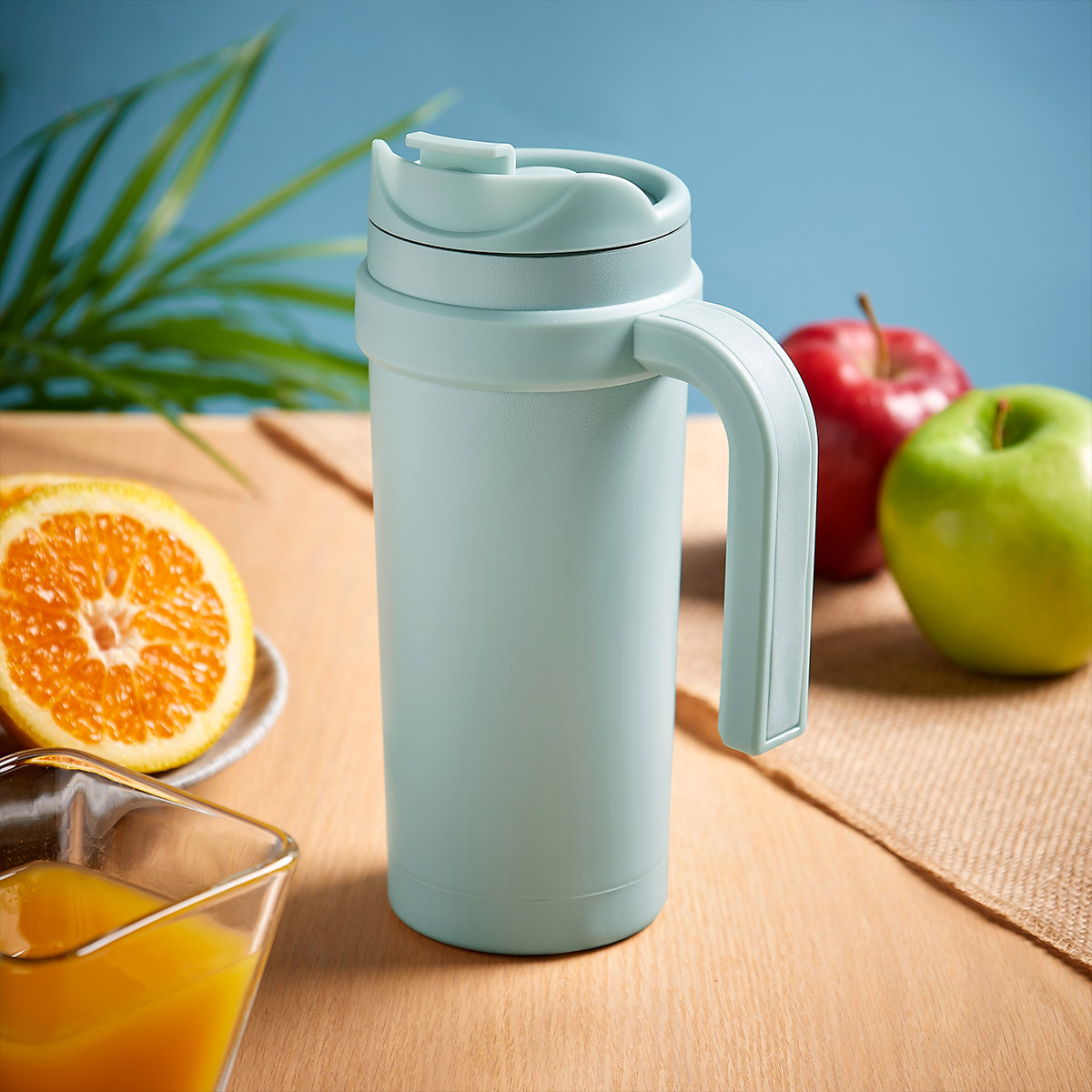 Doble pared. Cerrado al vacío. Pared interna y externa de acero inoxidable. Tapa de plástico con cierre de rosca y sobretapa de push. Asa de plástico. Mantiene temperatura caliente 6 hrs y fria 12 hrs. Incluye caja individual.